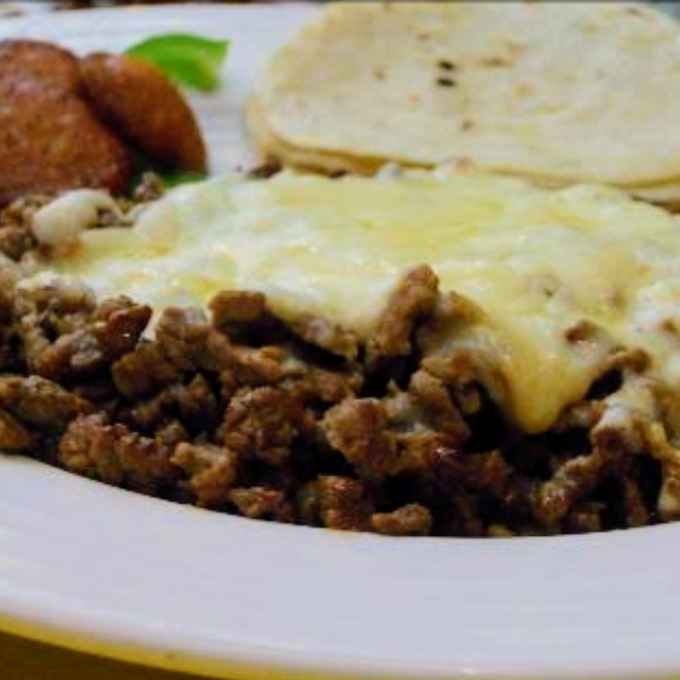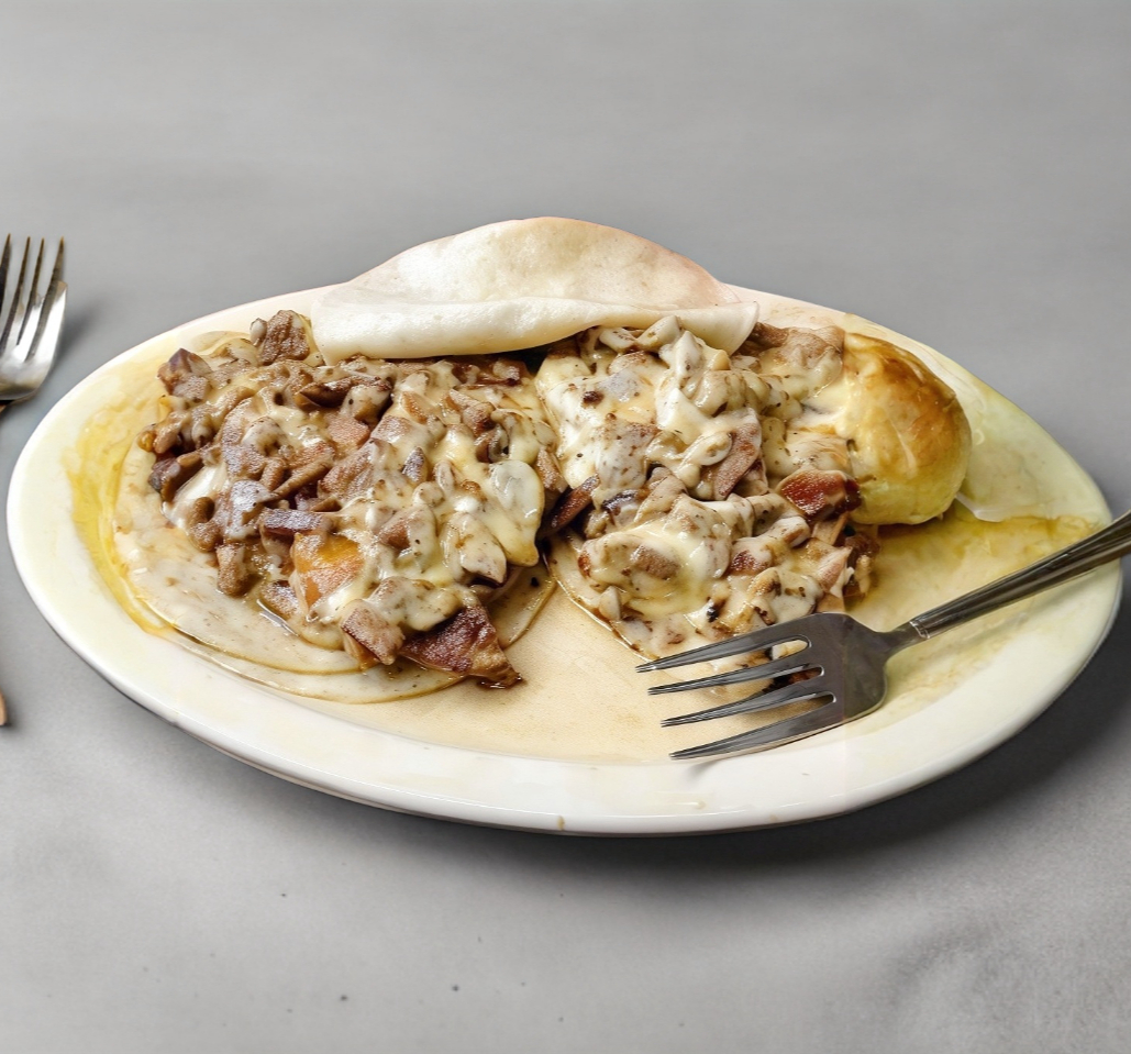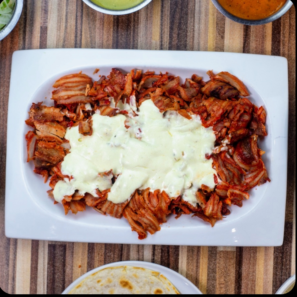Incluye salsa tortillas ensalada con limones cilantro y cebolla cebolla asada. Preparado con tocino jamón cebolla pimiento morrón queso y carne de pastor