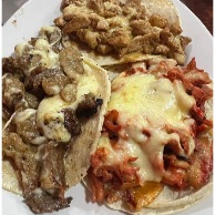 Gramaje de pastor, arrachera, chuleta y bisteck con queso, acompañado de porcion de papas, guacamole y cebollines