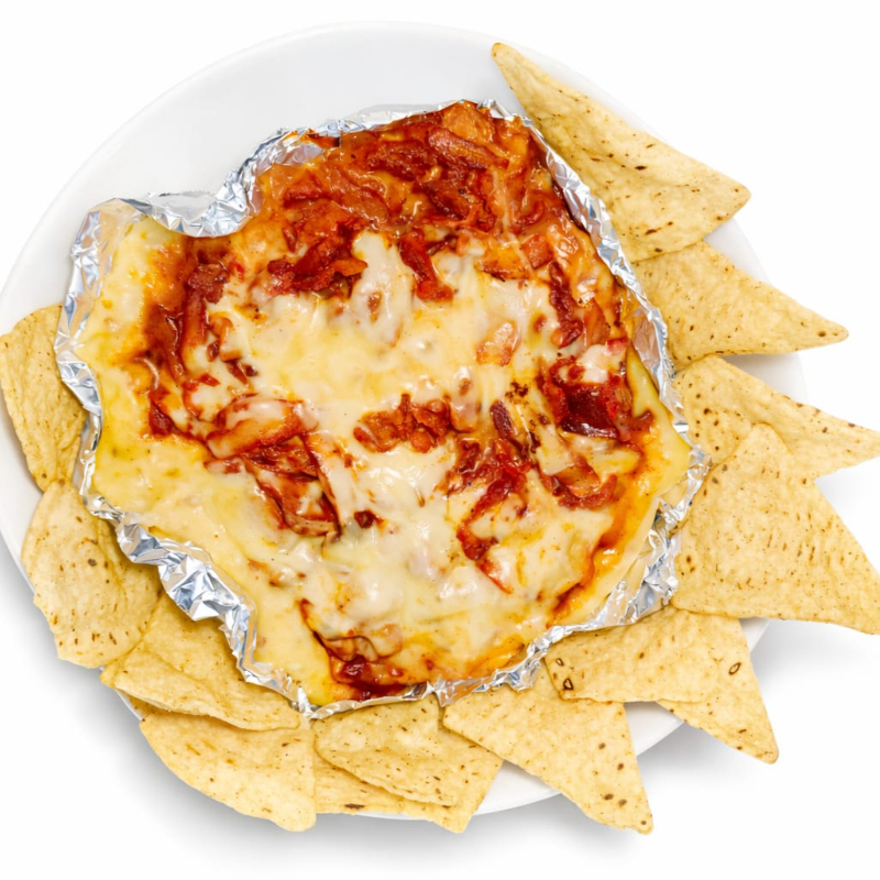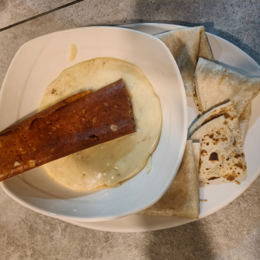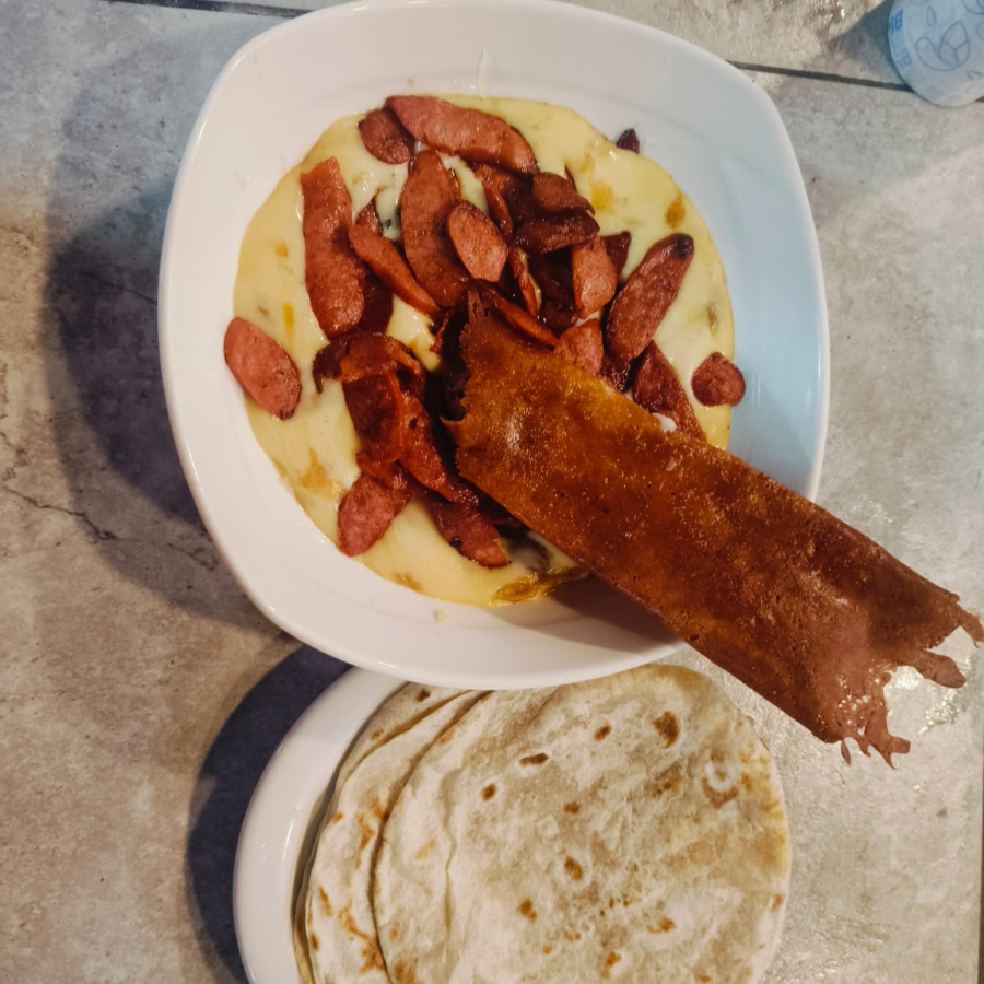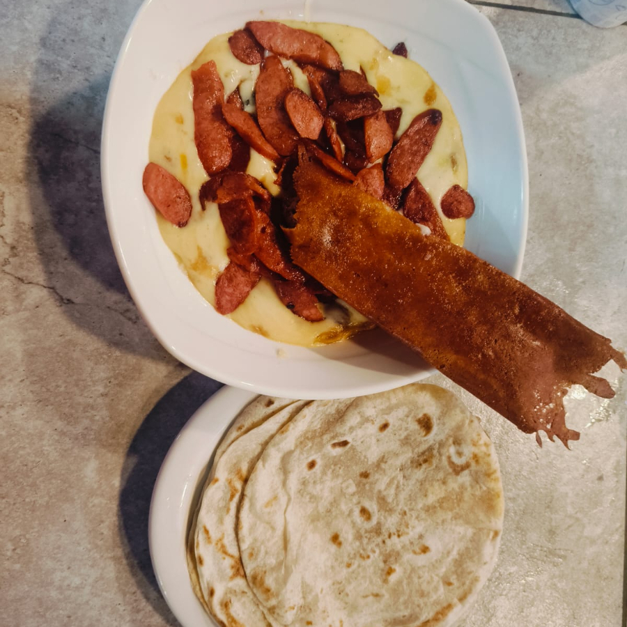 El queso de la casa fundido con deliciosos chistorra de cortesia una costra de queso, acompañado de tortillas de harina
