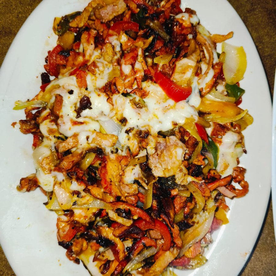 Delicioso alambre de arrachera con queso, pimientos, cebolla y tocino