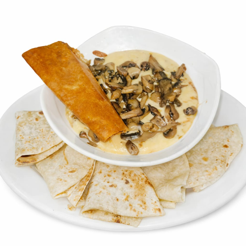 El queso de la casa fundido con deliciosos champiñones de cortesia una costra de queso, acompañado de tortillas de harina