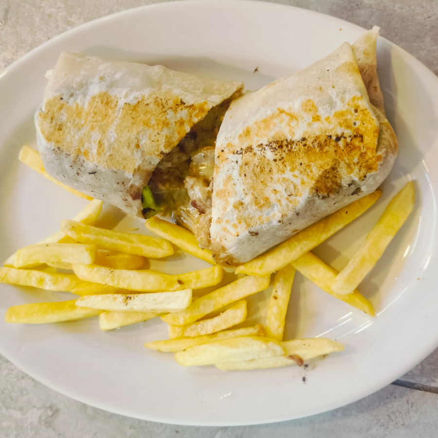 Deliciso burrito de pastor acompañado de una porcion de papas
