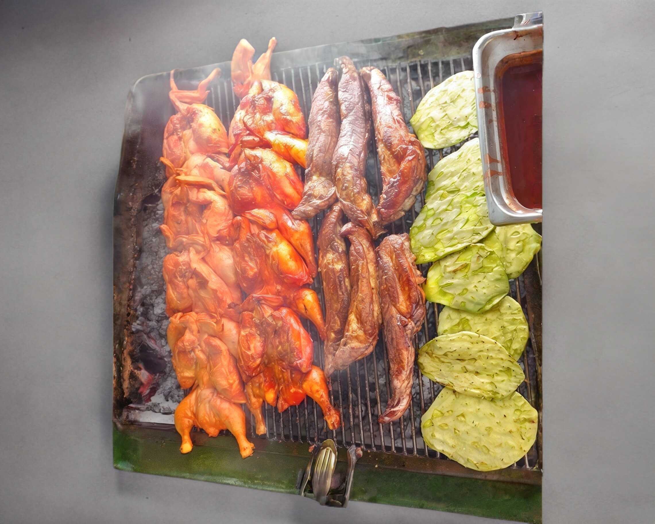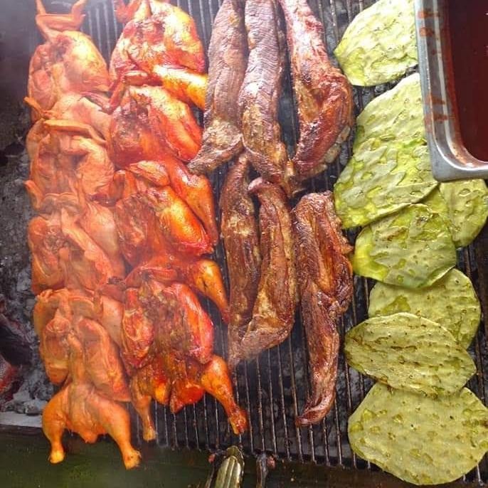 Pollo asado y 1 queso asado. incluye tortillas, chiles toreados, nopal, cebollitas asadas y salsa