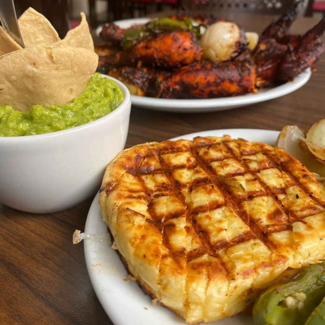 Medio pollo asado y medio adobado incluye un queso asado, tortillas, chiles toreados, nopal, cebollitas asadas y salsa
