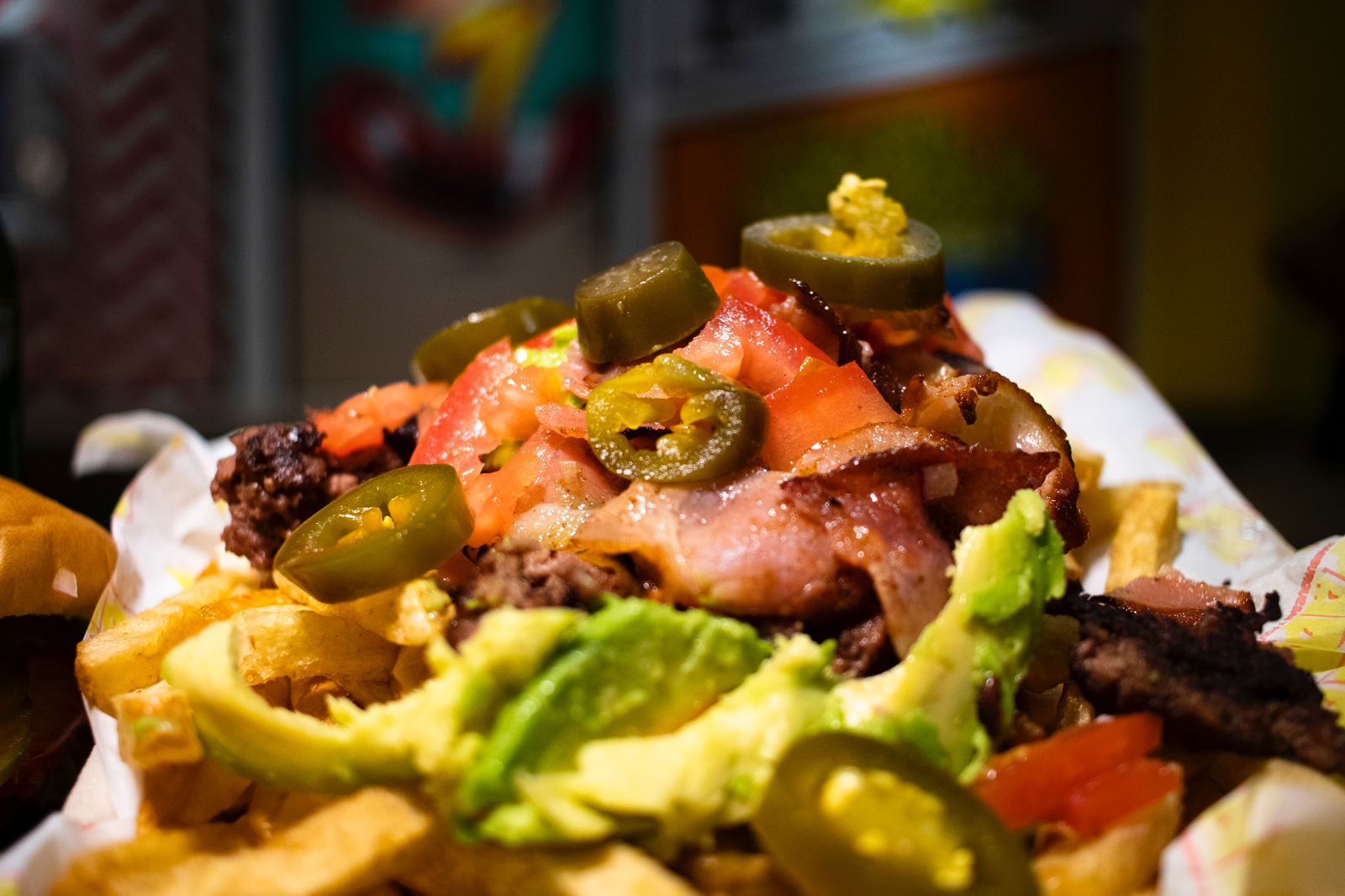 Papas naturales fritas, salsa de res, queso de hebra, carne angus, tocino, aguacate, cebolla, jalapeños y tomate.