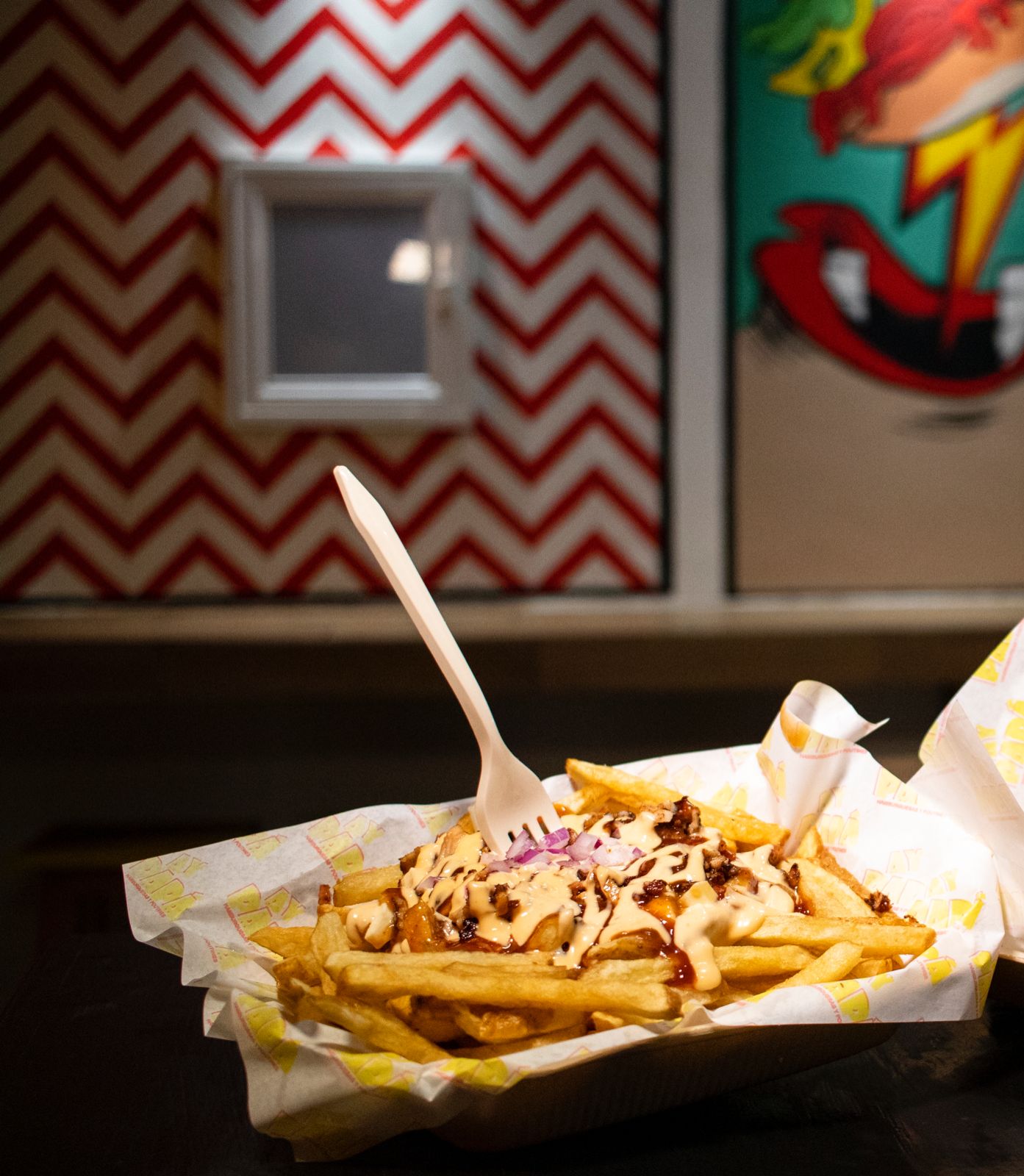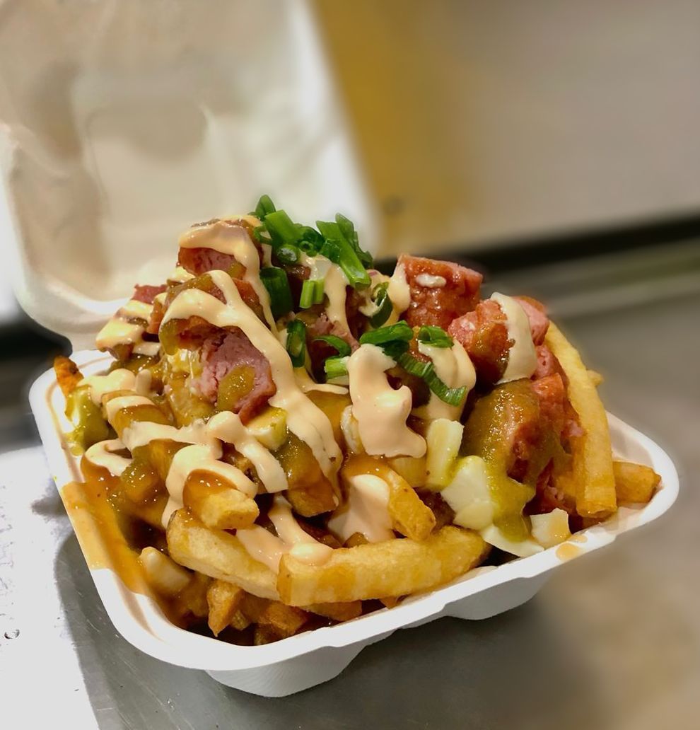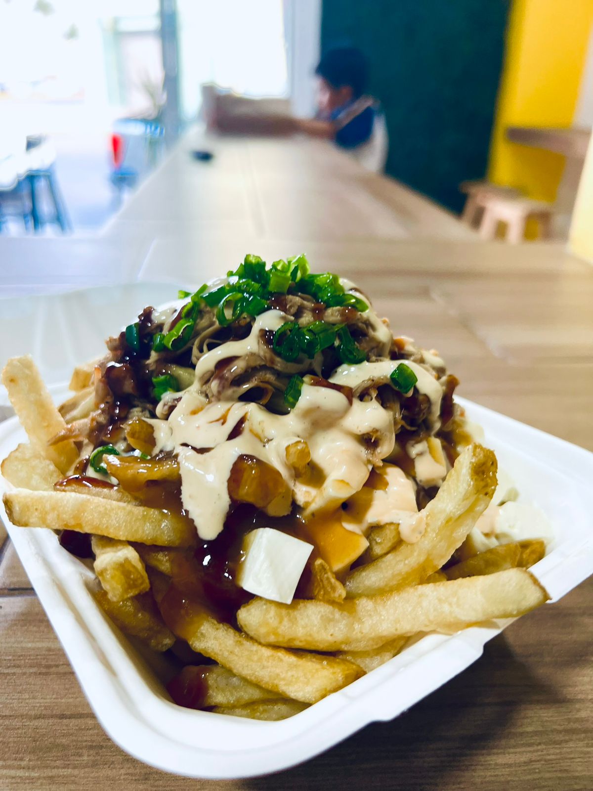 Papas naturales fritas, salsa de res, queso de hebra, salchicha frita, salsa thai y salsa secreta.