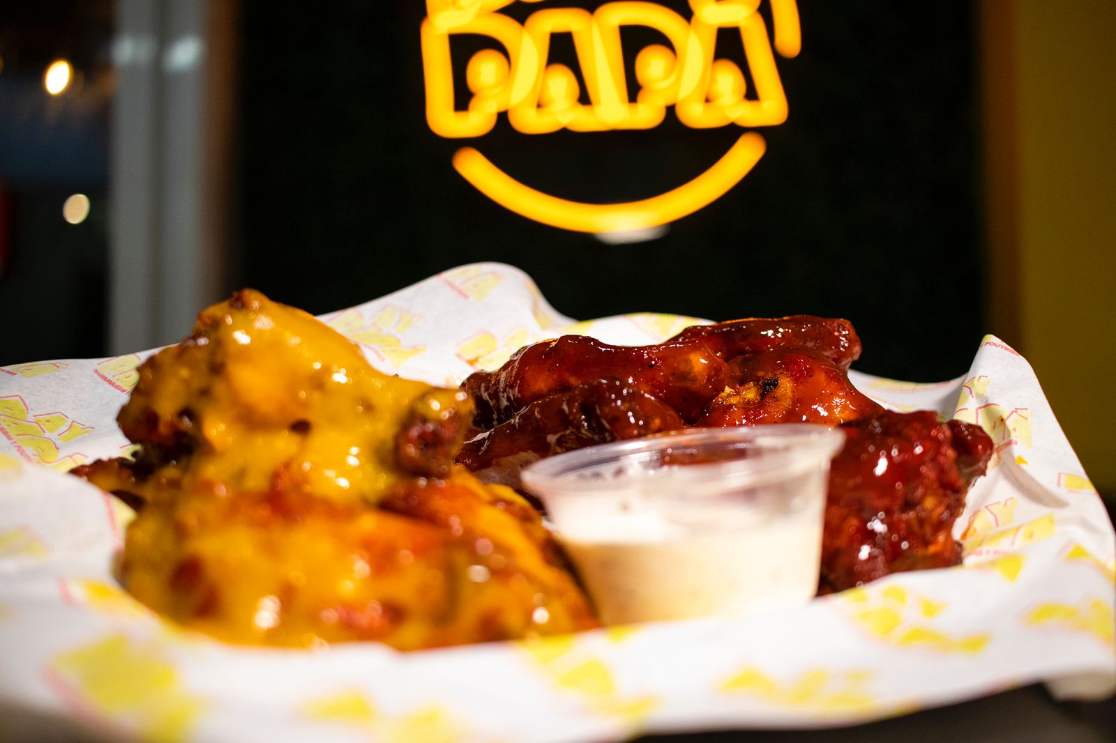 Papas naturales fritas, salsa de res, queso de hebra, pechuga de pollo empanizada, salsa secreta, salsa thai y cebollín.