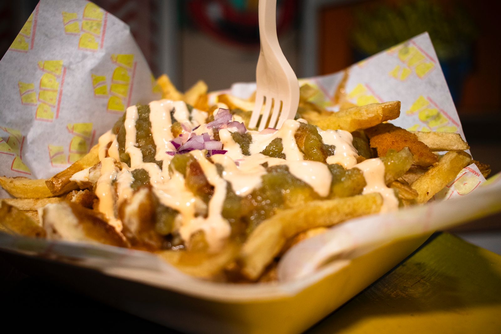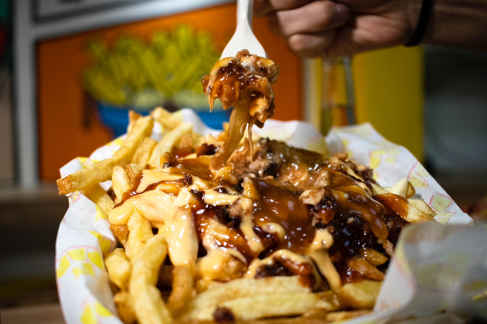 Papas naturales fritas, salsa de res, queso de hebra, pulled pork, salsa BBQ, salsa secreta, jalapeños y cebollín.