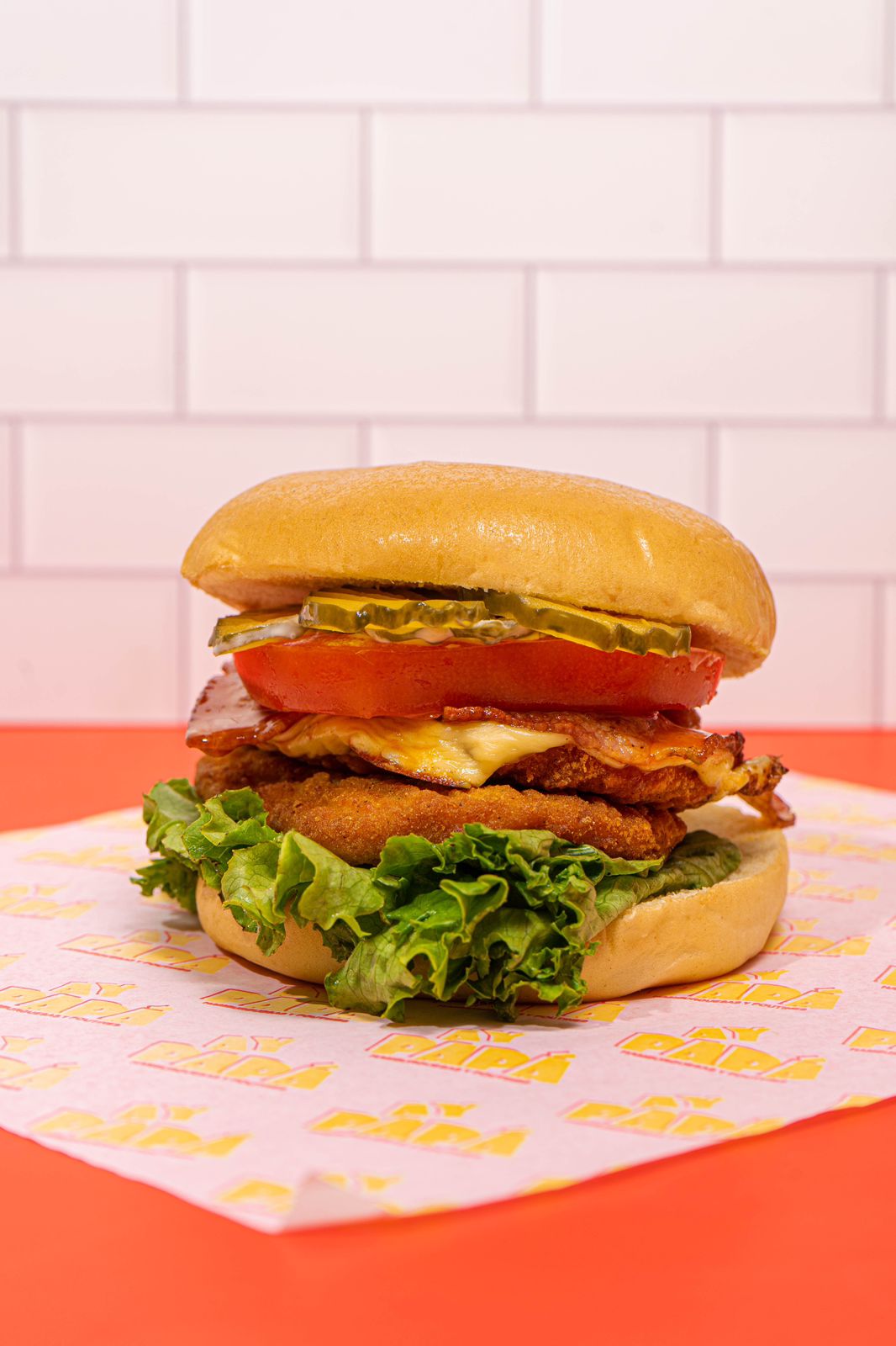 Pechuga de pollo empanizada, queso manchego, tocino, lechuga, tomate, salsa secreta y salsa thai.