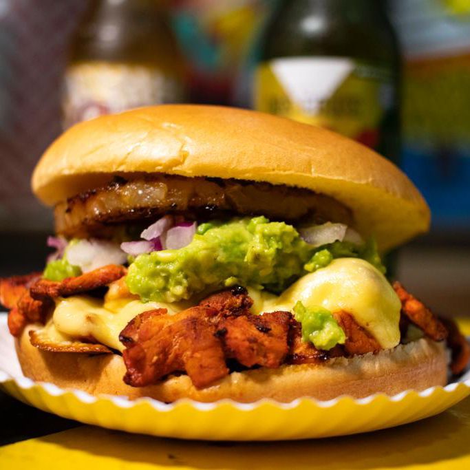 Carne de cerdo al pastor, piña a la plancha, queso manchego, guacamole, cebolla y salsa mango habanero.