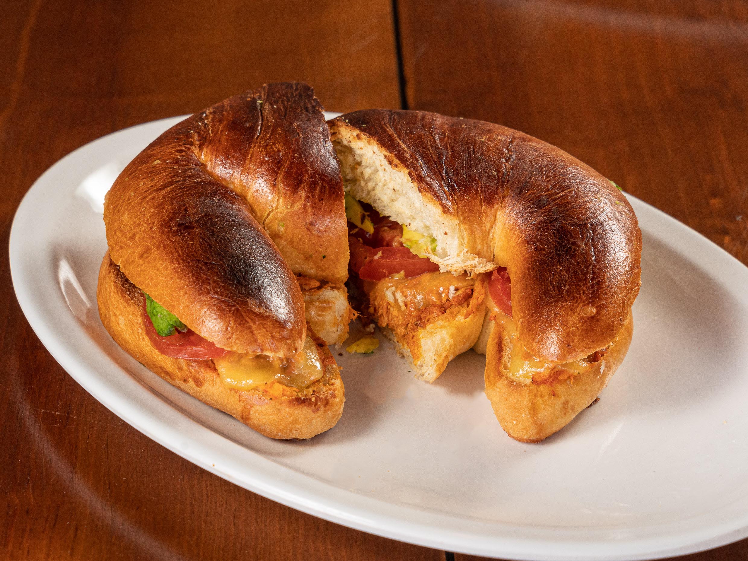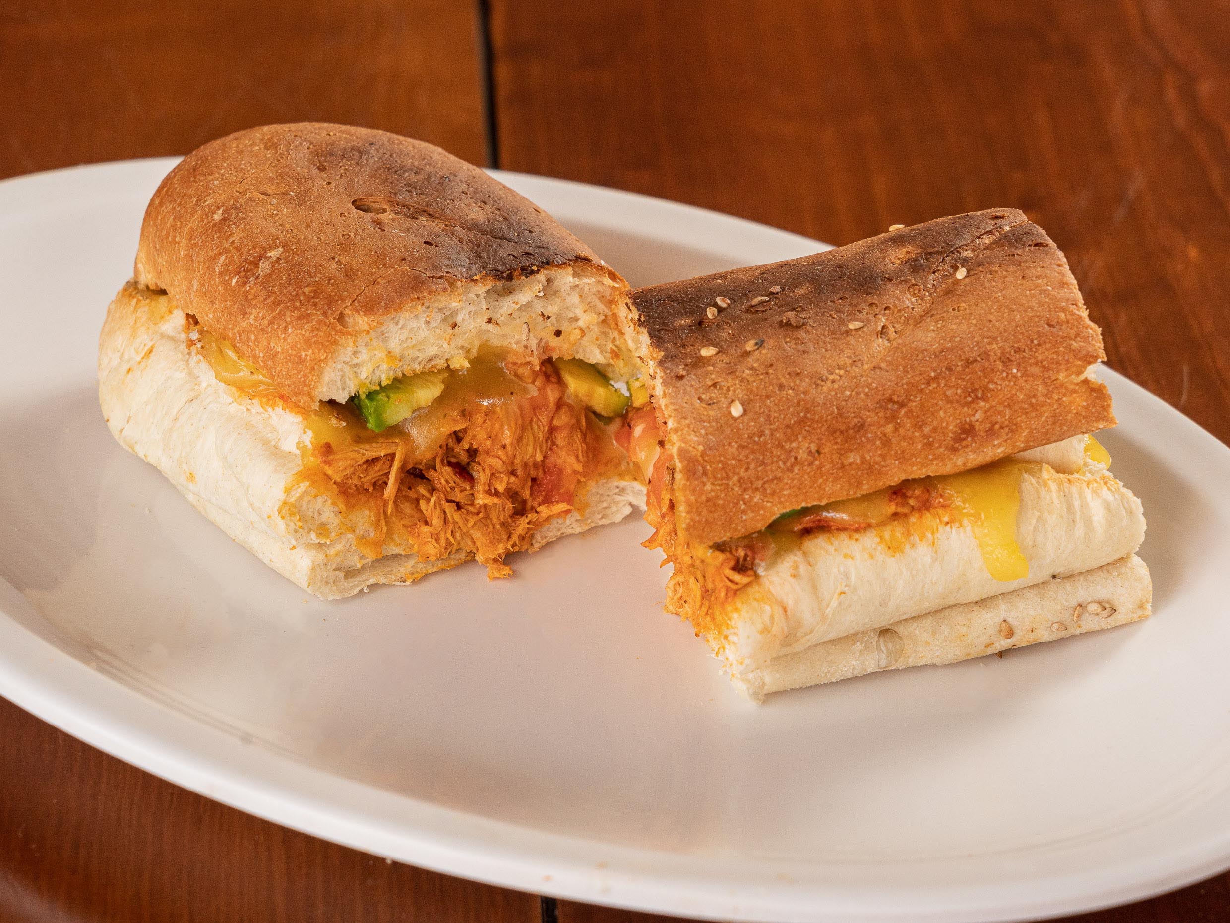Pollo enchilado, queso gouda, jitomate, aguacate y mayonesa, con pan baguette horneado en casa.