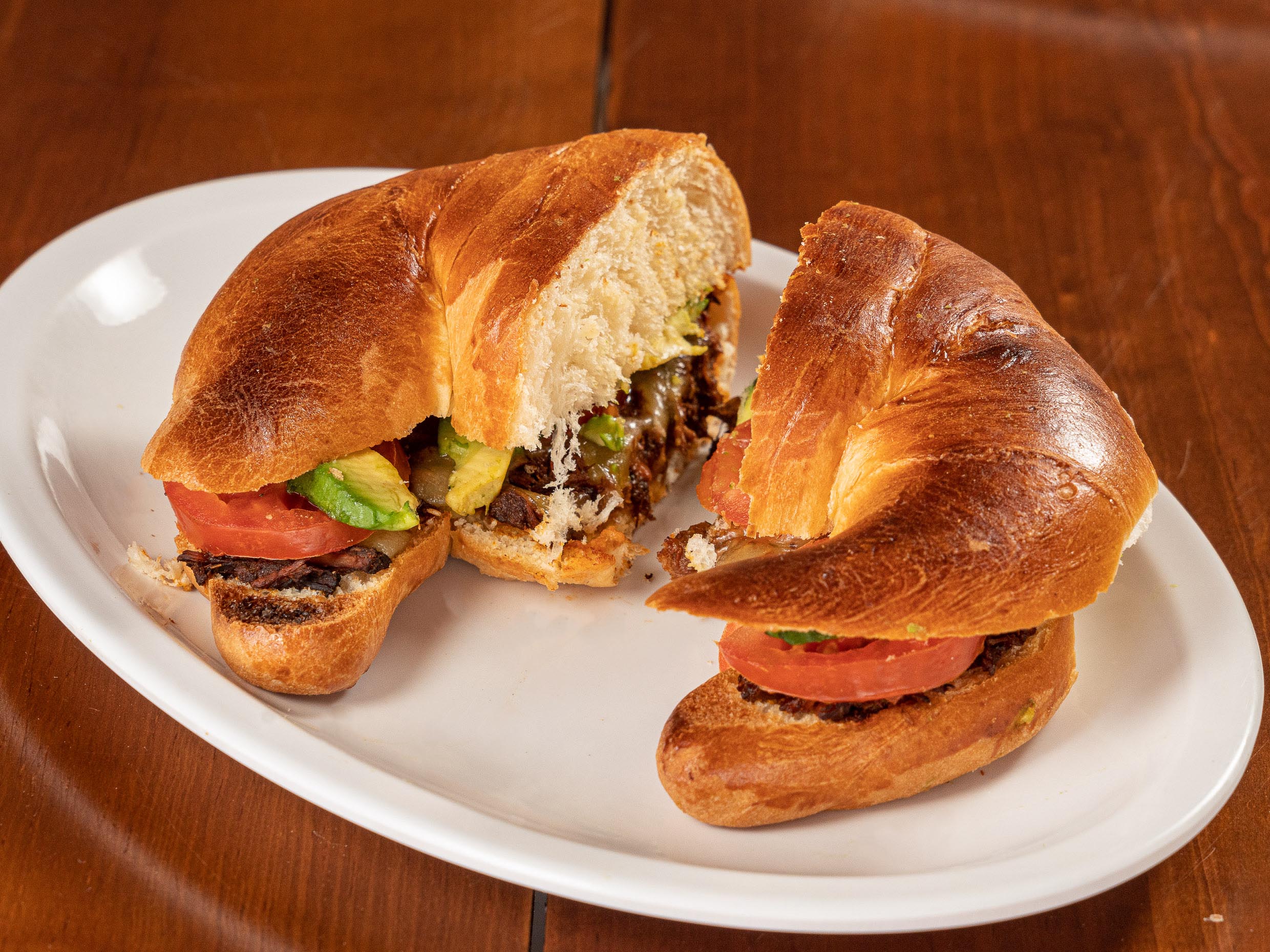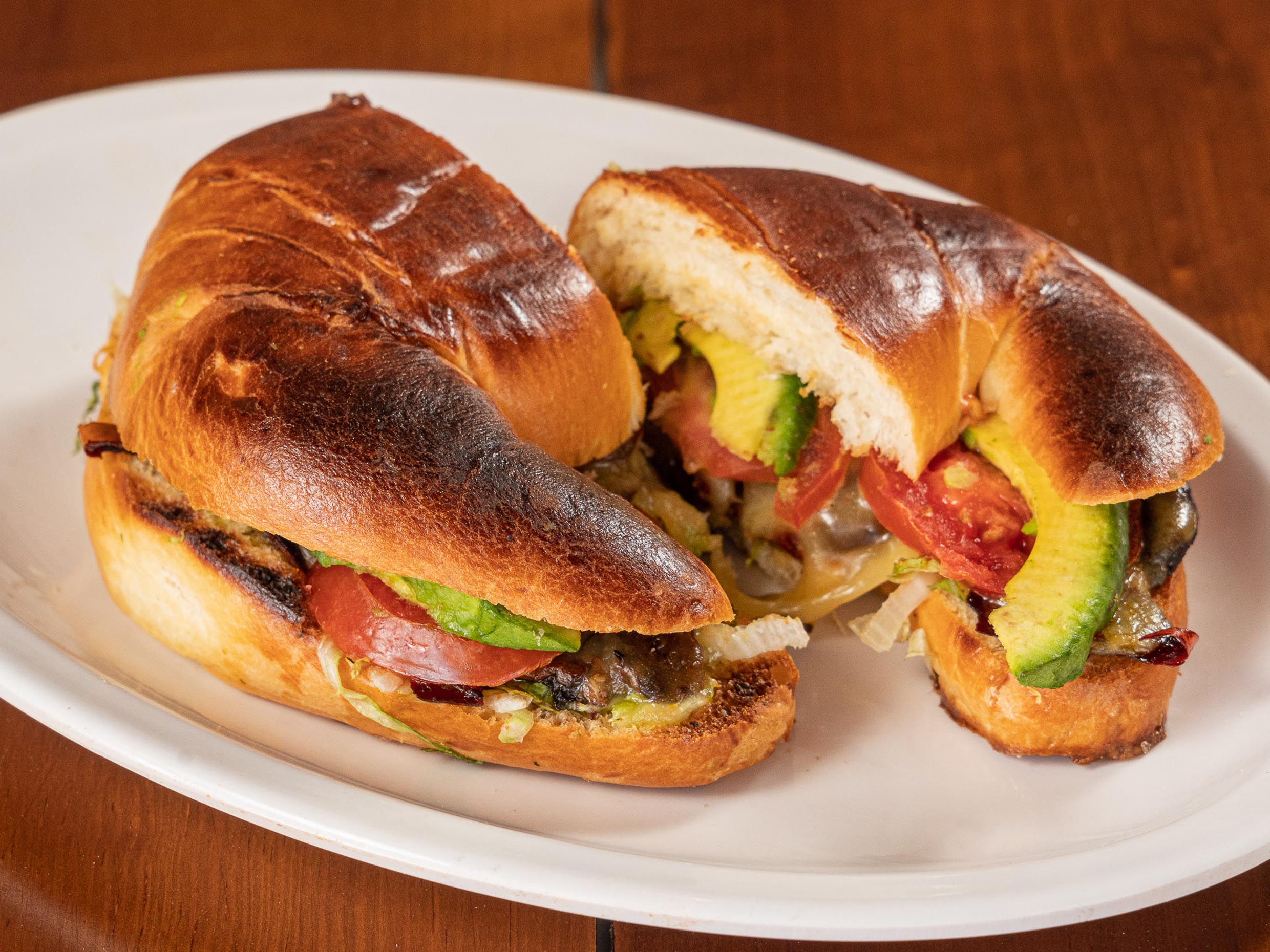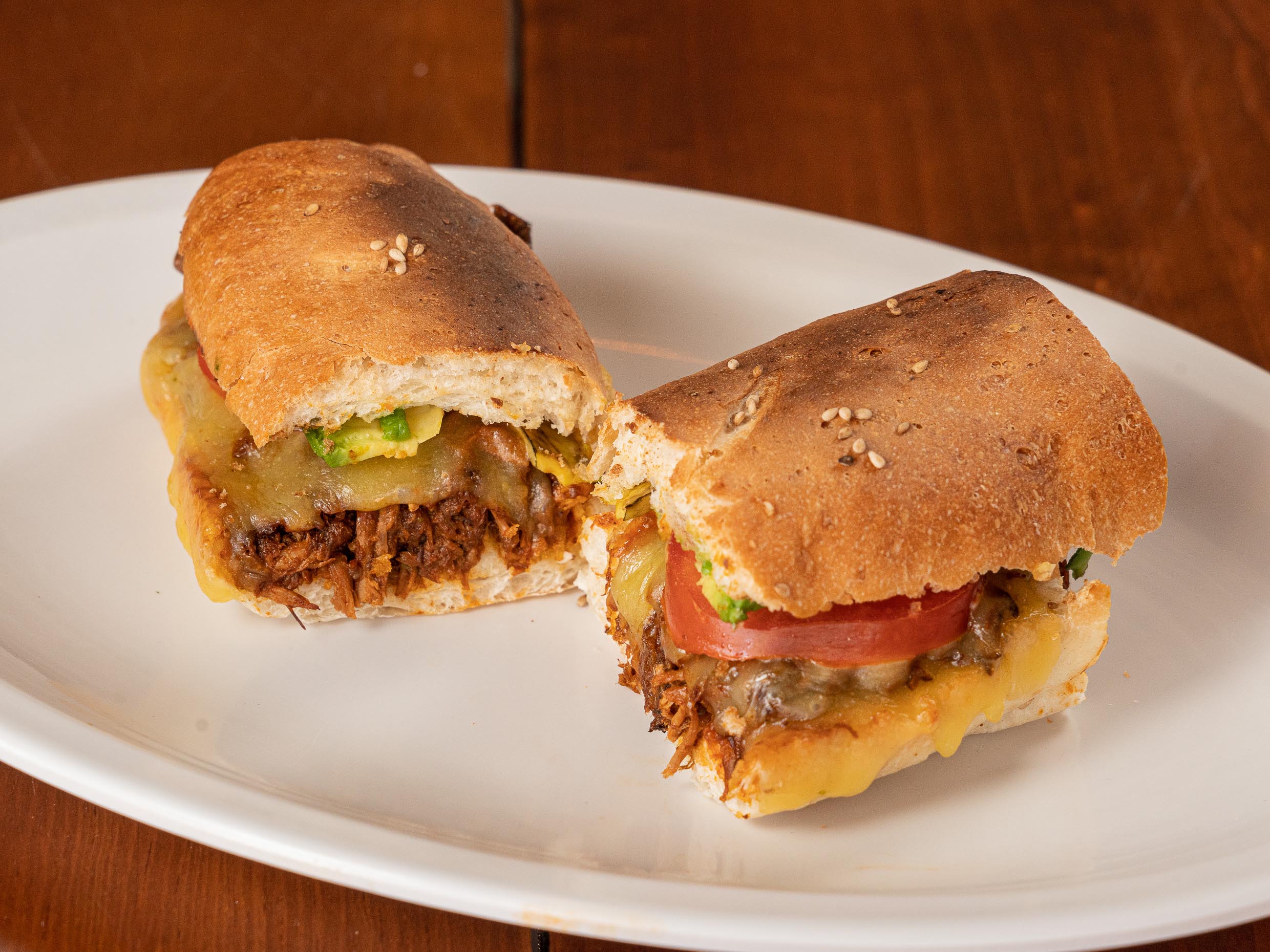 Pambazo tradicional con queso gouda, tomate, aguacate y proteína a elegir.