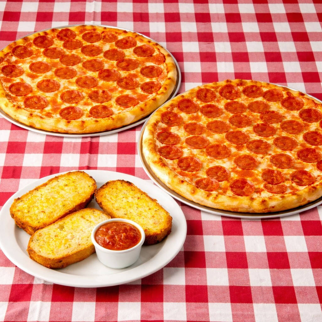 Elige tus dos pizzas medianas de 8 rebanadas + una entrada.