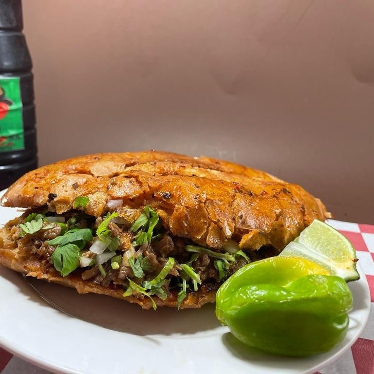 Pan con mayonesa, birria, cebolla y cilantro, bañado con consomé.