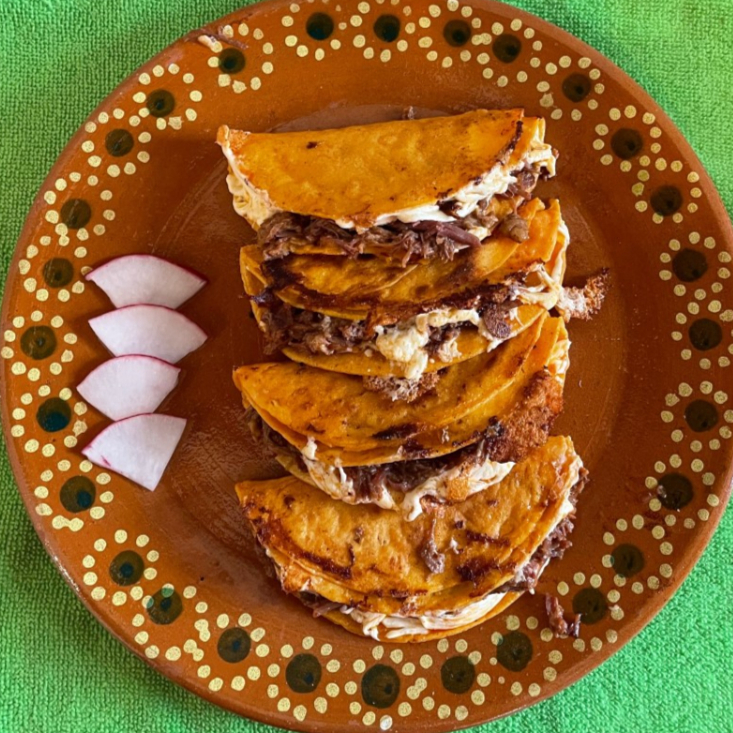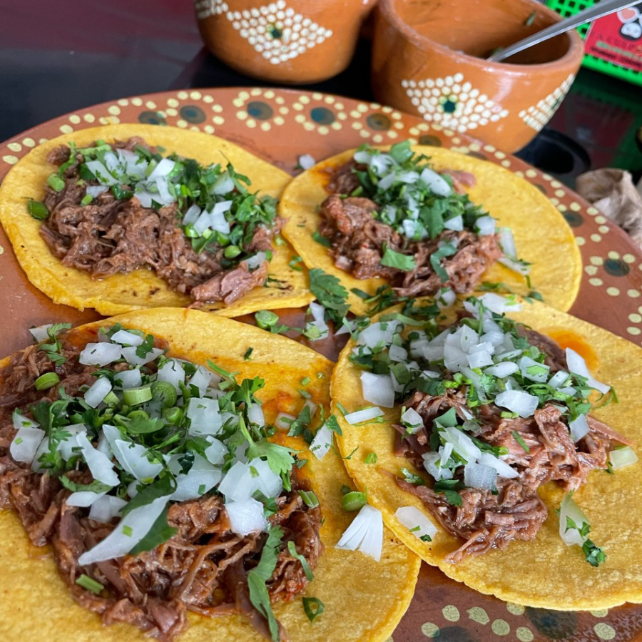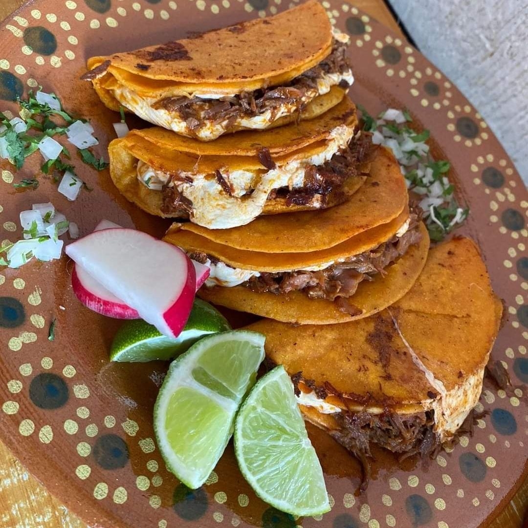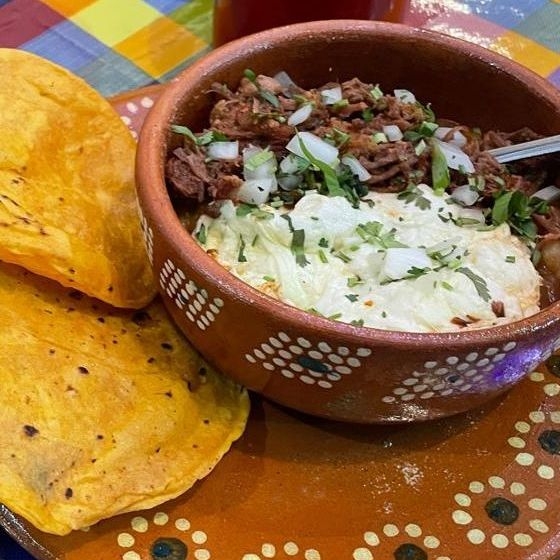 Tortillas crujientes bañadas en consomé, coronados con birria de res, crema, queso, cebolla y un toque de cilantro.