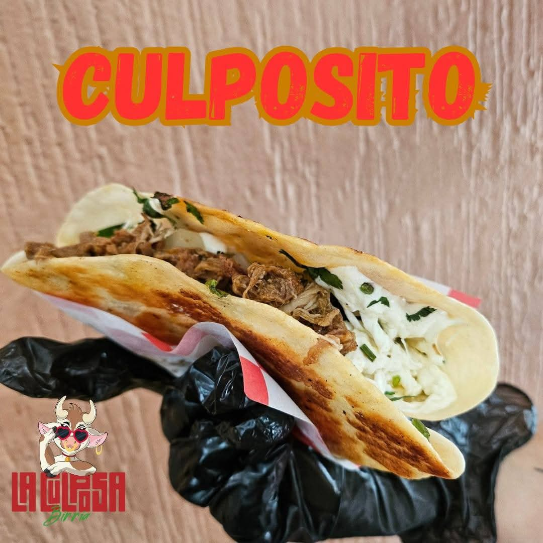 Doble tortilla, birria, queso de hebra derretido y remojado en consomé.