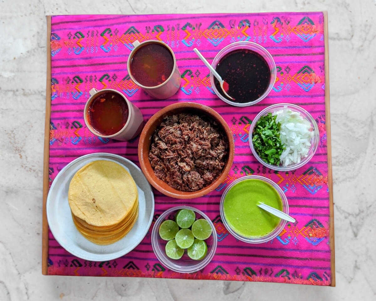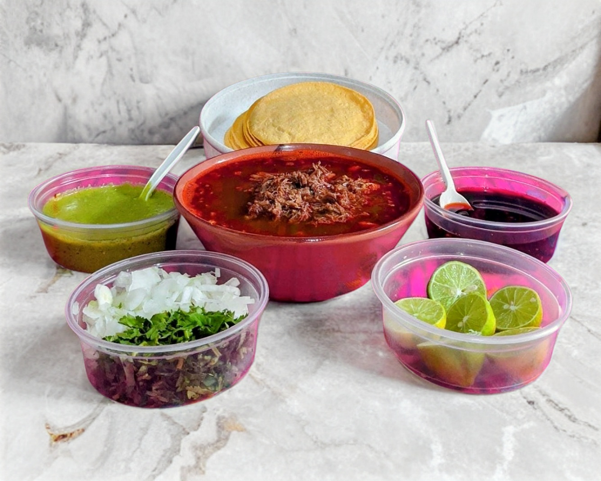 Medio litro de birria (carne con consomé) acompañado de tortillas, limones, salsa verde y cilantro con cebolla