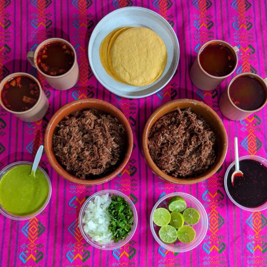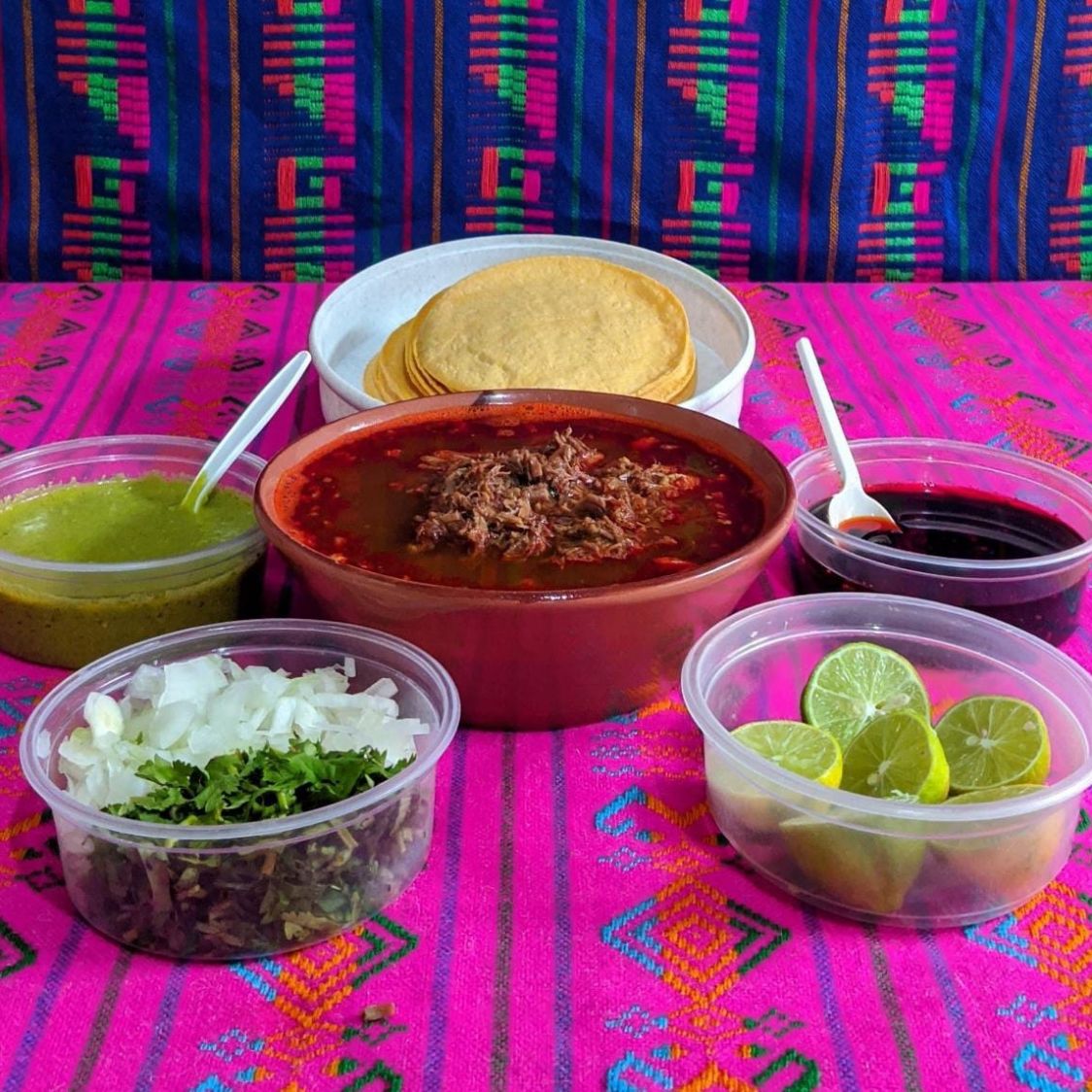 PAQUETE FAMILIAR (5-7 PERSONAS) QUE INCLUYE: 1 KILO DE CARNE, 1 LITRO DE CONSOMÉ, MEDIO KILO DE TORTILLAS, LIMONES, CILANTRO CON CEBOLLA Y SALSA VERDE
