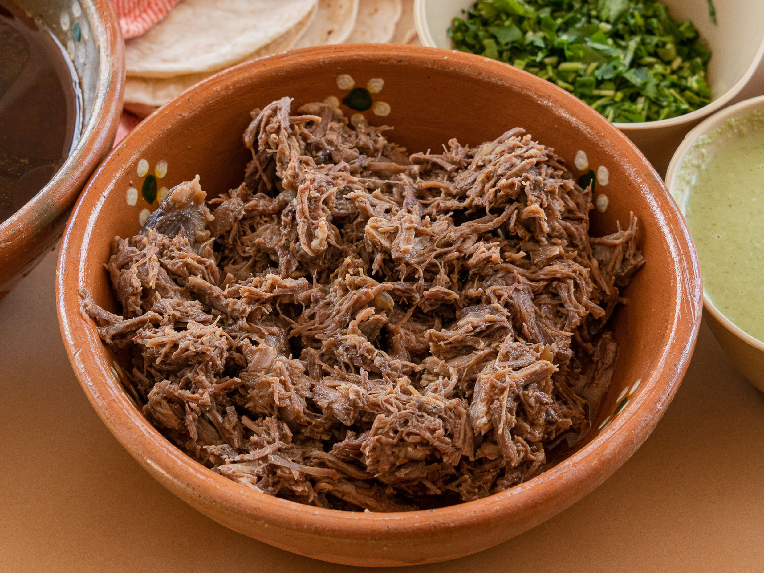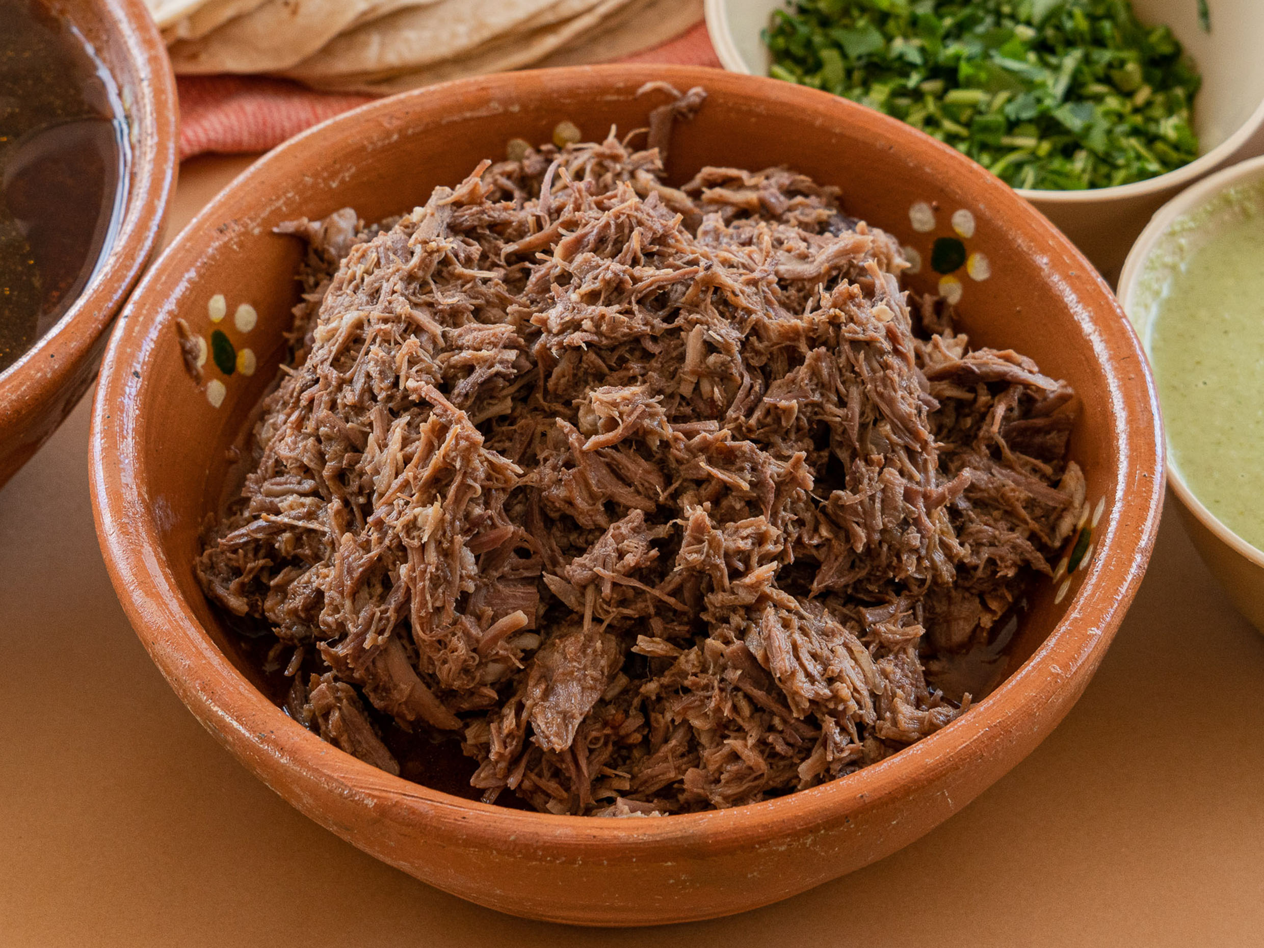 1 Kg de carne de borrego, incluye 4 consomes, cebolla, cilantro, salsa verde, salsa roja, limón, 1/2 kg de tortilla.