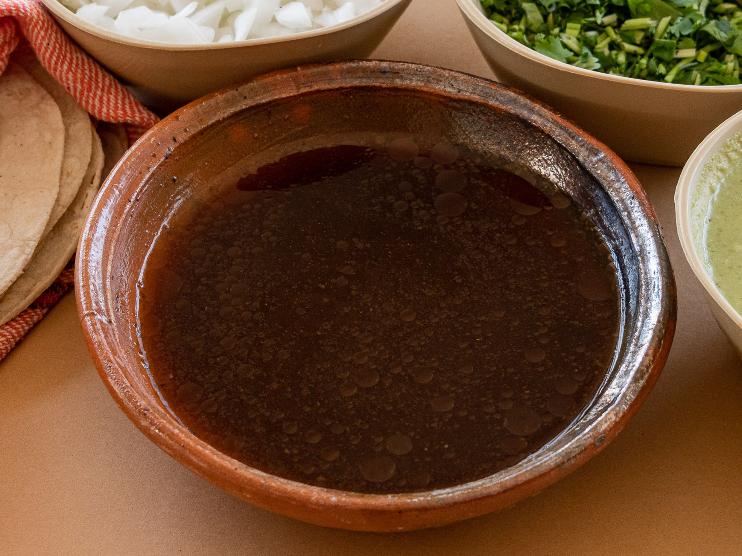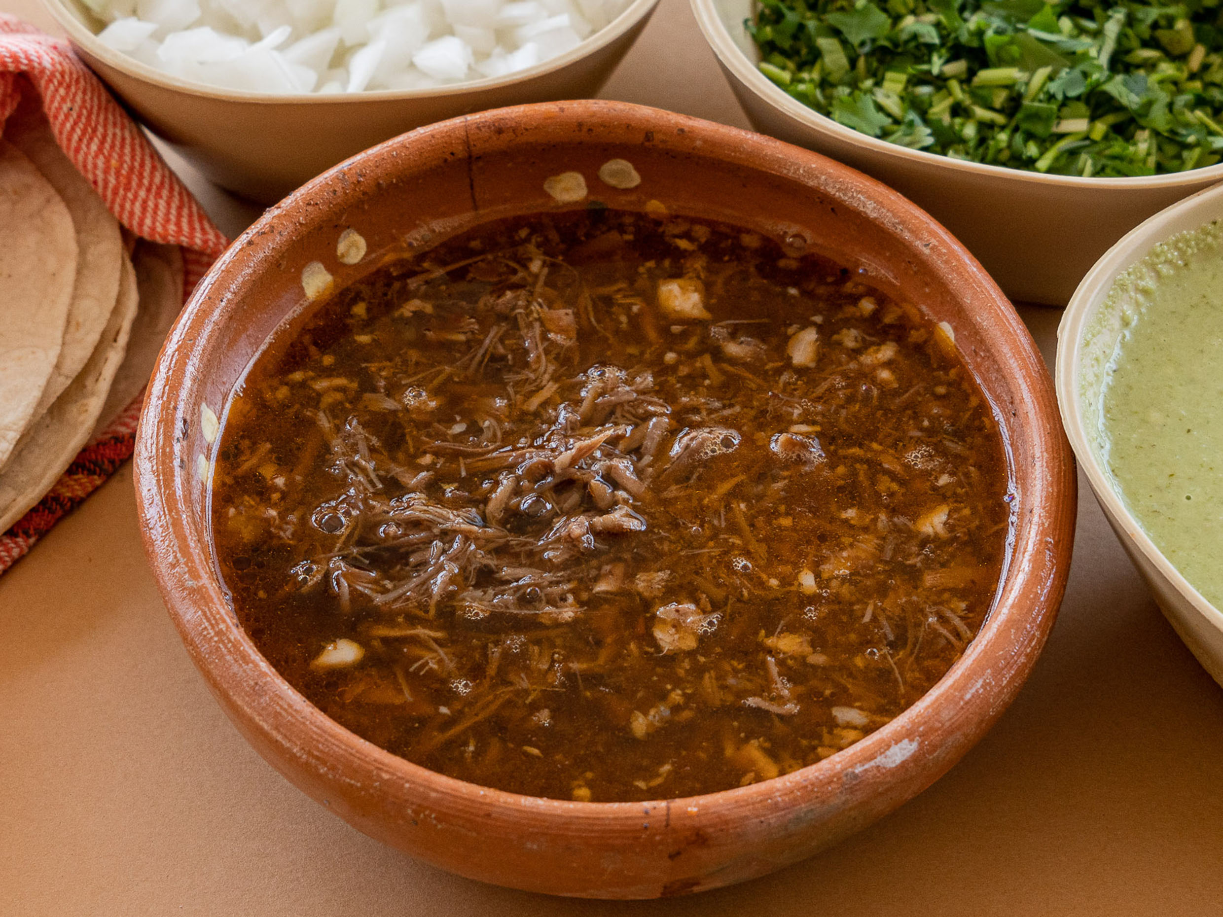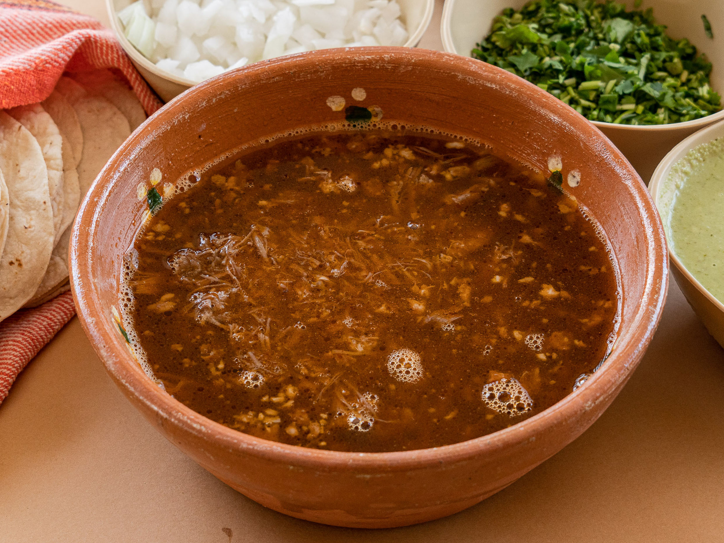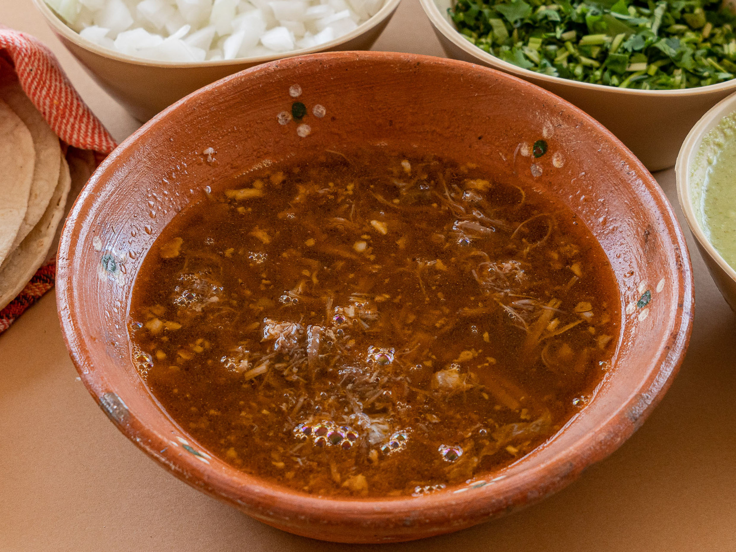 175 gr. de carne de borrego con 400ml. de consomé acompañado de cebolla, cilantro, salsa roja o verde, limón y tortillas