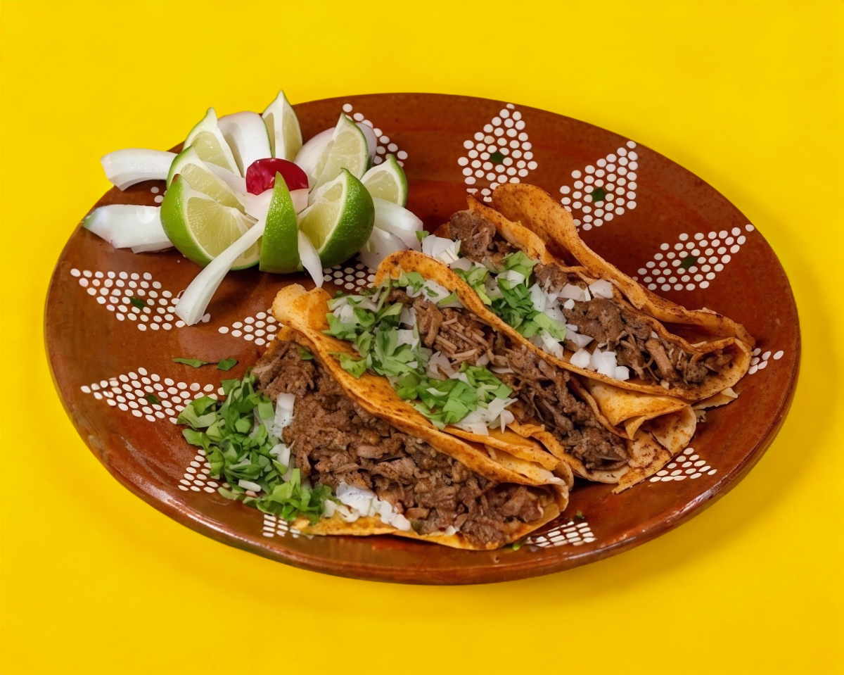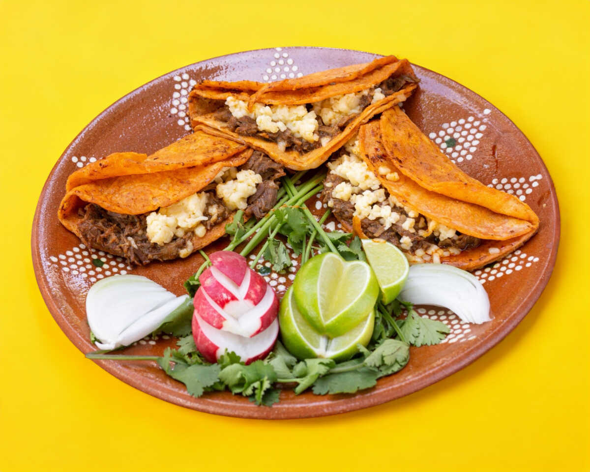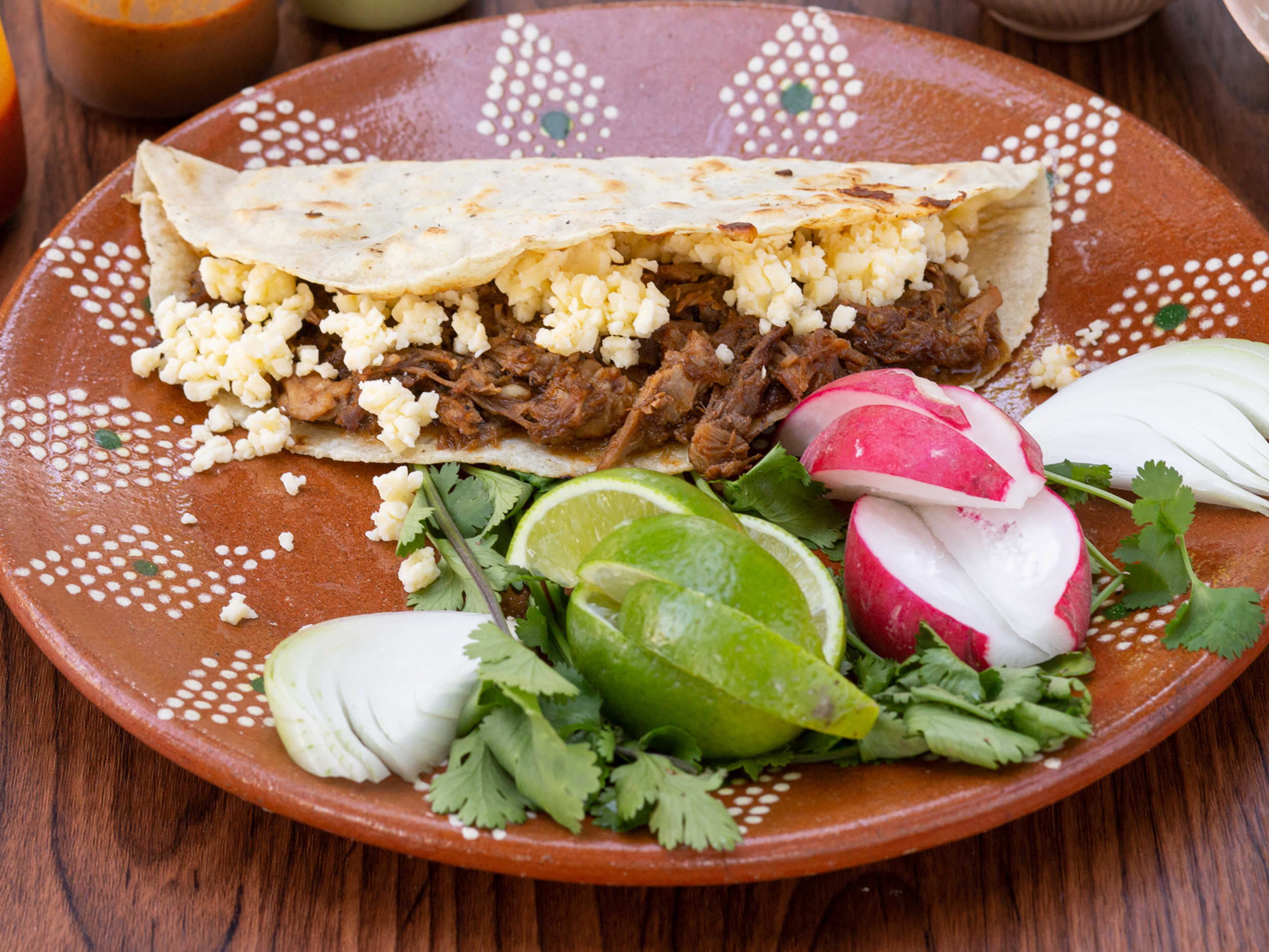 Tortilla de maíz xl recién hecha, con birria de res y quesos mozzarella. Acompañado de cebolla, cilantro, rábano, limón y salsa de tu elección.