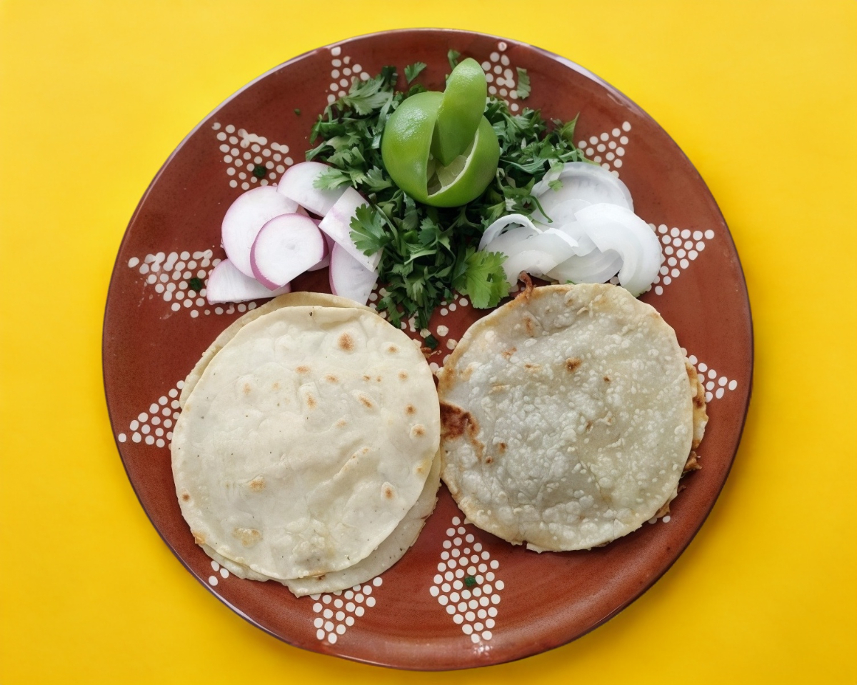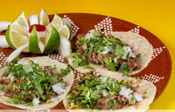 Tortilla de maíz, carnitas de cerdo (Chamorro), acompañado de cilantro, cebolla, rábano, limón, salsa de su elección.