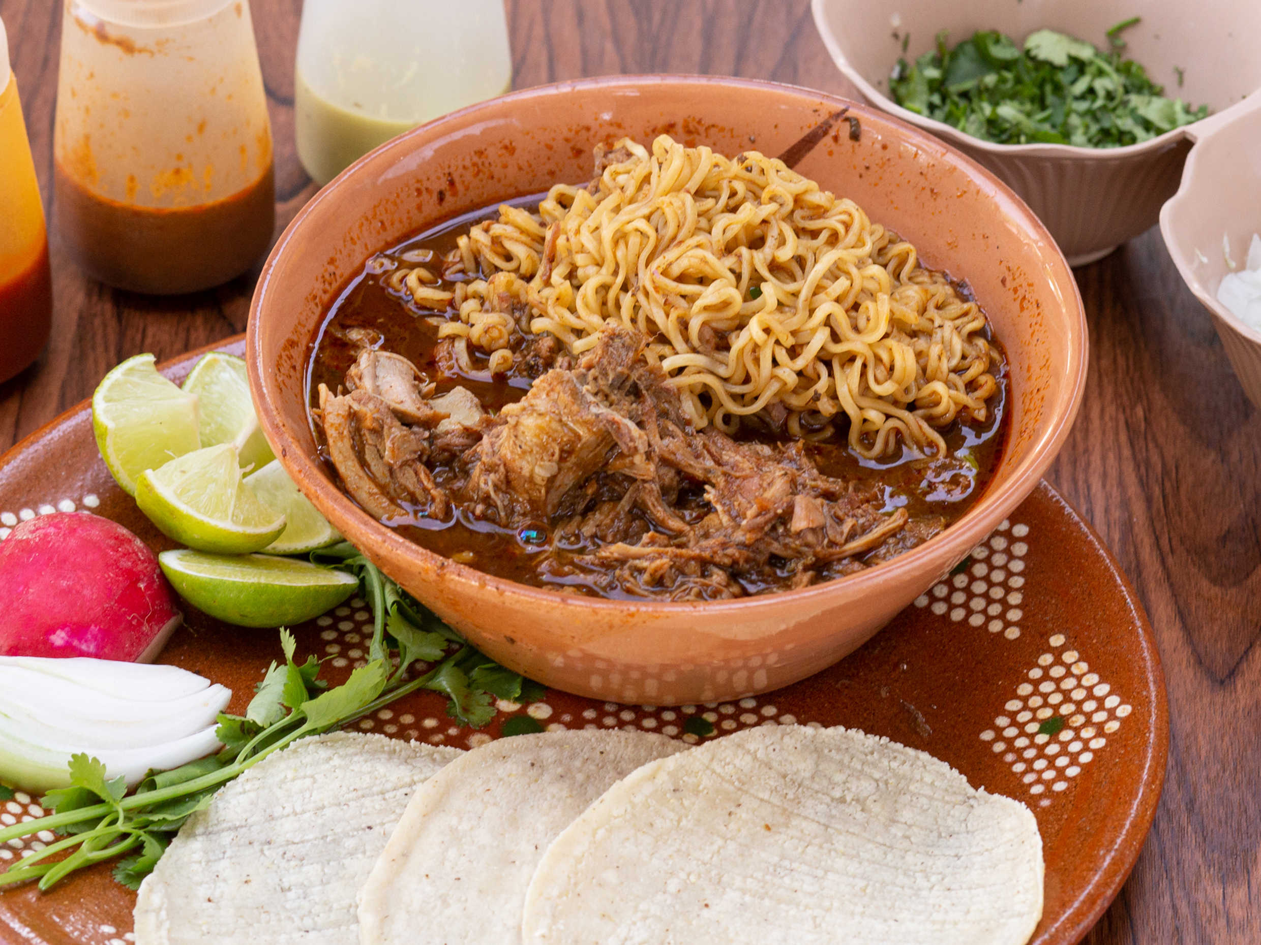 Pasta de rame, birria de res, 6 tortillas de maíz recién hechas. Acompañada de cebolla, cilantro, rábano, limón y la salsa de tu elección.