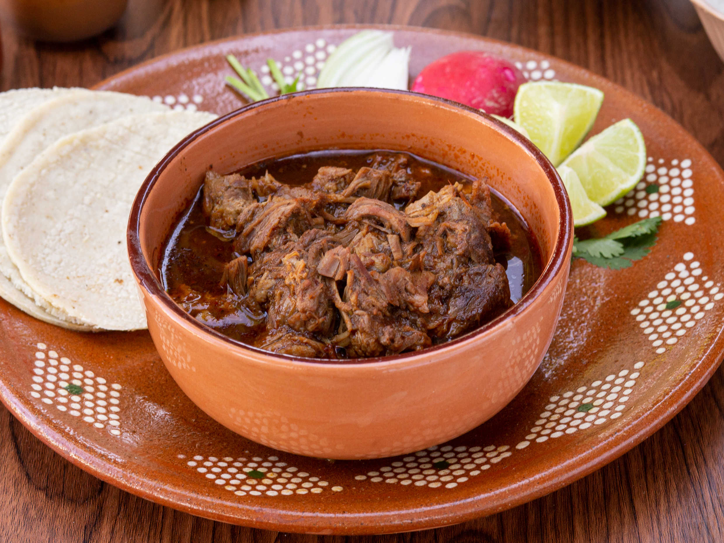 Birria de res grande, 8 tortillas de maíz recién hechas. Acompañada de cebolla, cilantro, rábano, limón y salsa de tu elección.