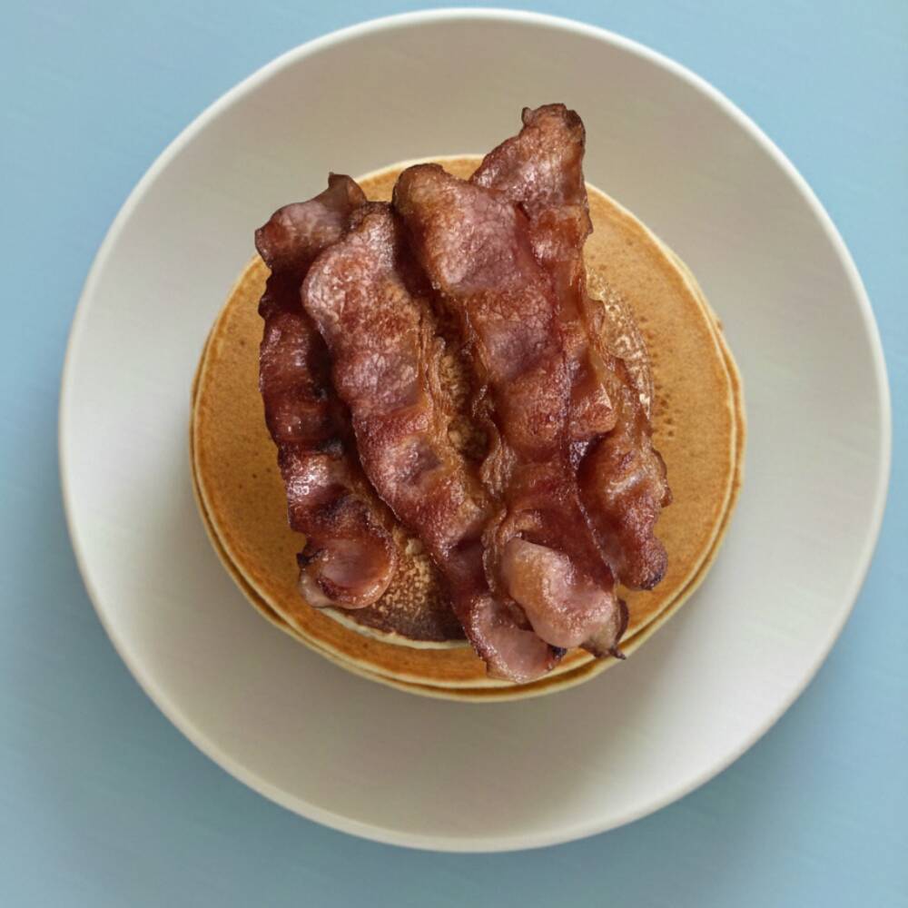 Tres hot cakes con tocino crujiente y miel de maple.