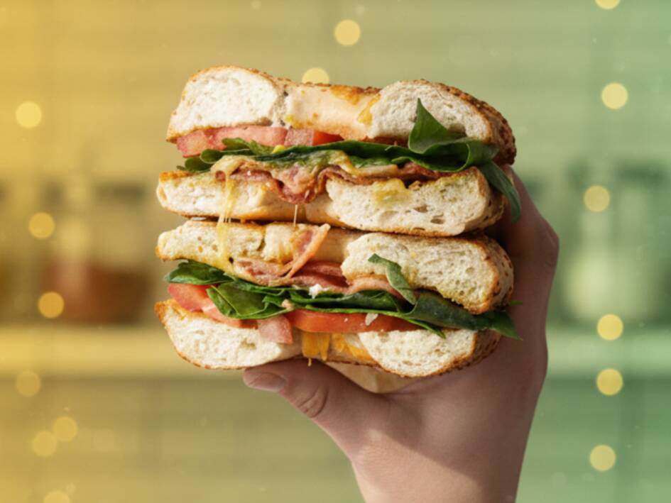 Tocino crujiente, queso crema suave, jitomate y lechuga.