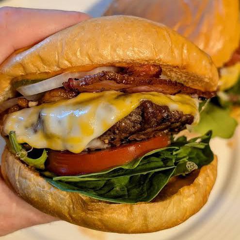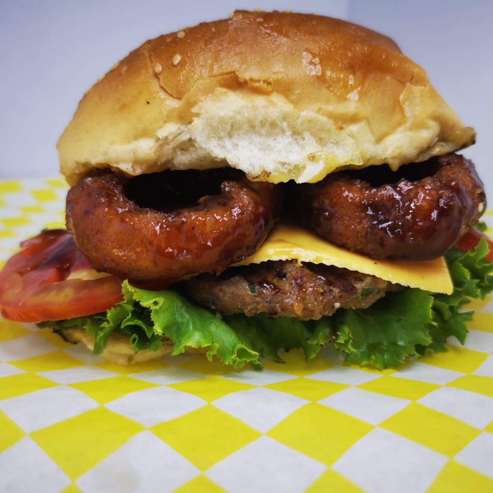 Carne sazón de la casa, con 3 aros de cebolla bañadas en BBQ o búfalo, queso americano, lechuga, tomate, cebolla.