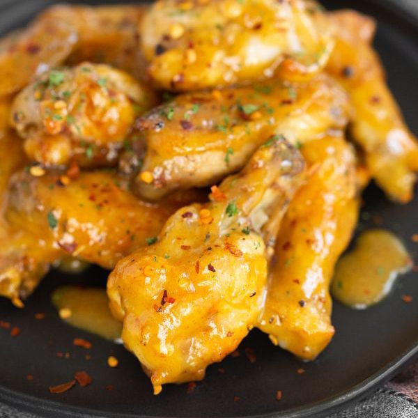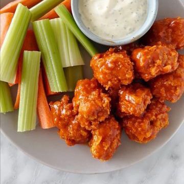 Trozos de pollo crujiente bañados en salsa búfalo, ligeramente picante, 5 piezas.