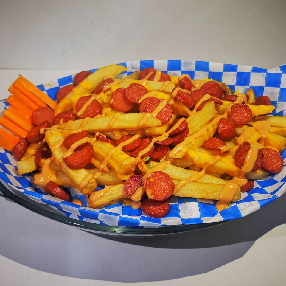 300 g De papas condimentadas con el sabor de la casa, acompañadas de salchicha premium bañado con aderezo cheddar y chipotle.