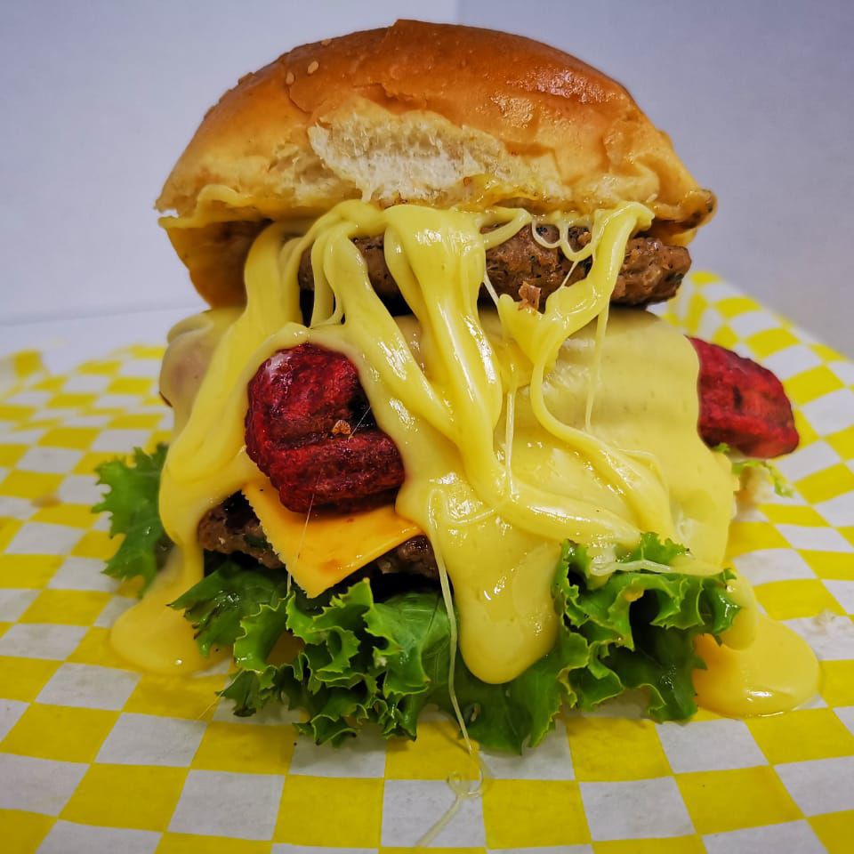 Doble carne sazón de la casa, salchichón asadero, queso americano, tomate, cebolla, bañado por dentro con queso gouda derretido.