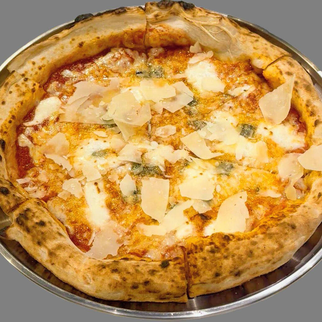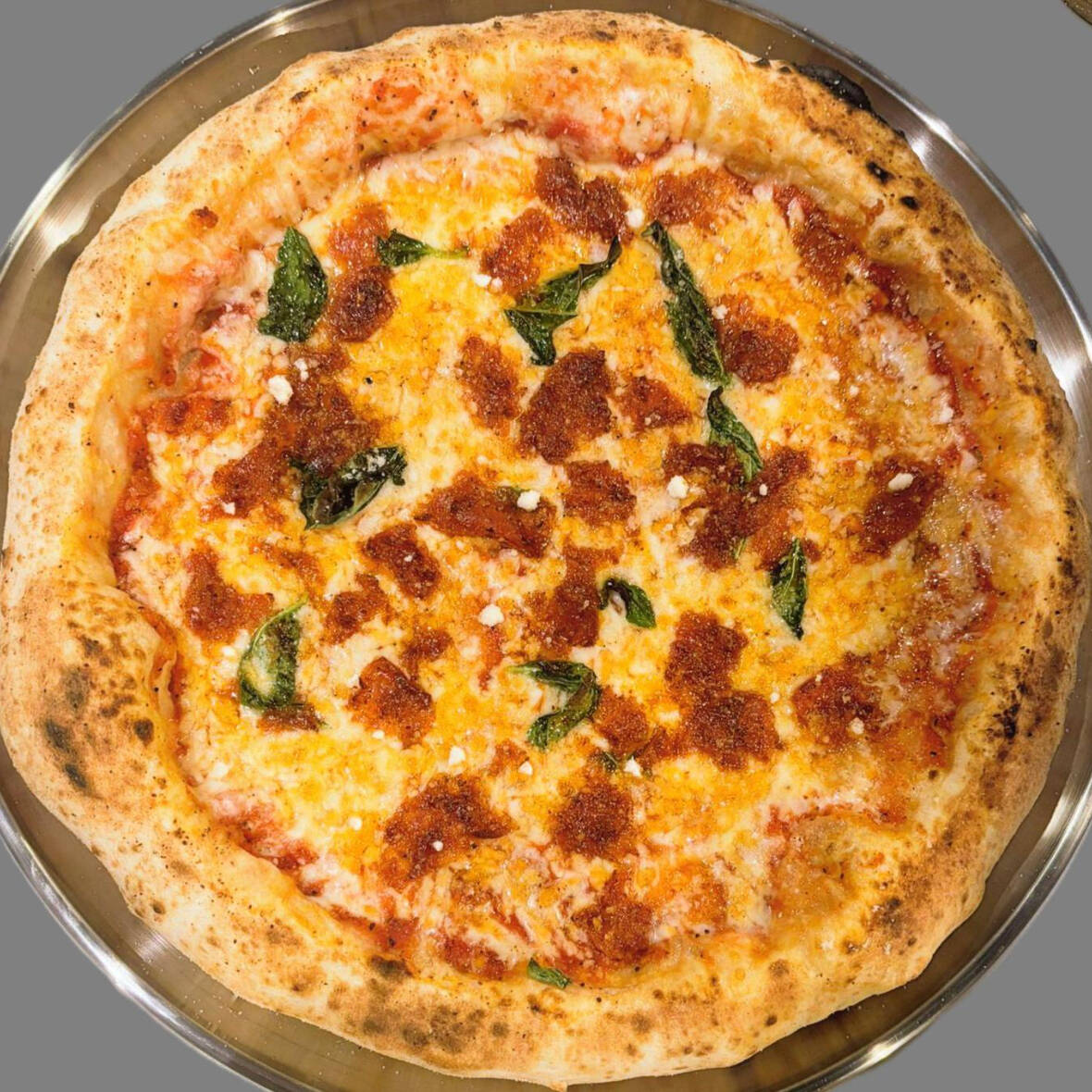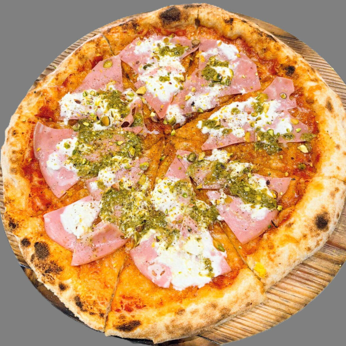 Salsa de tomate fresco con un toque de sal y pimienta, gratinada con abundante queso Monterrey Jack. Adornado con delicadas lonjas de mortadela italiana, pistaches verdes, una mezcla de cremosa stracciatella y pesto de albahaca; todo coronado con refrescante ralladura de limón amarillo. Diámetro 33~35 cm