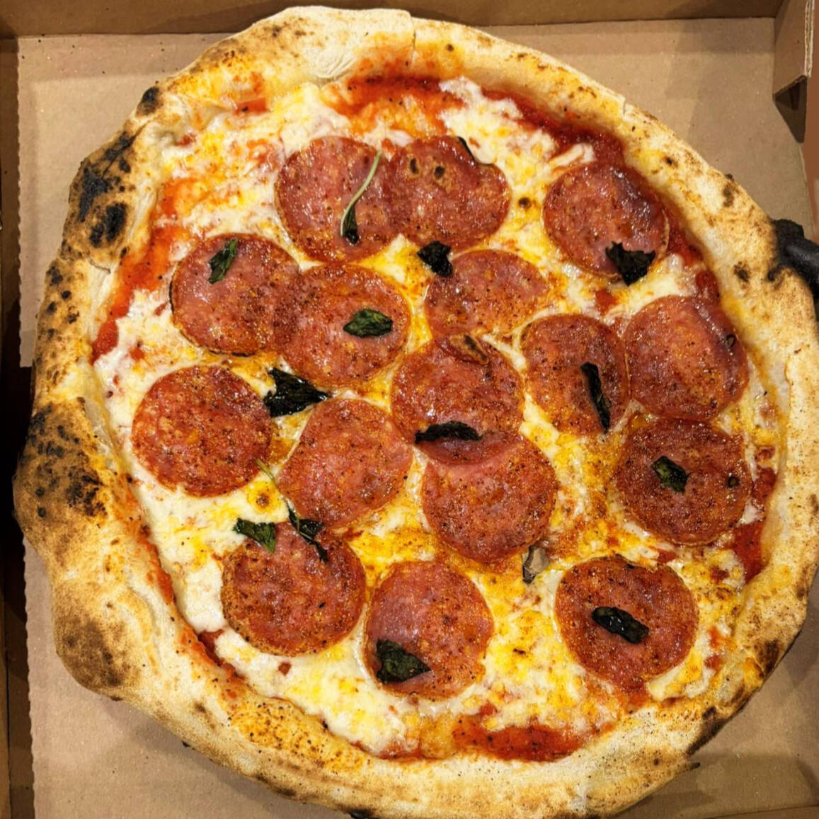 Salsa de tomate fresco con un toque de sal, pimienta y su base de queso Monterrey Jack, el especial sabor de nuestro picosito salami calabrese, albahaca fresca del huerto, queso grana padano recién rallado y especiado con peperoncino y pimienta negra recién molida. Diámetro 33~35 cm