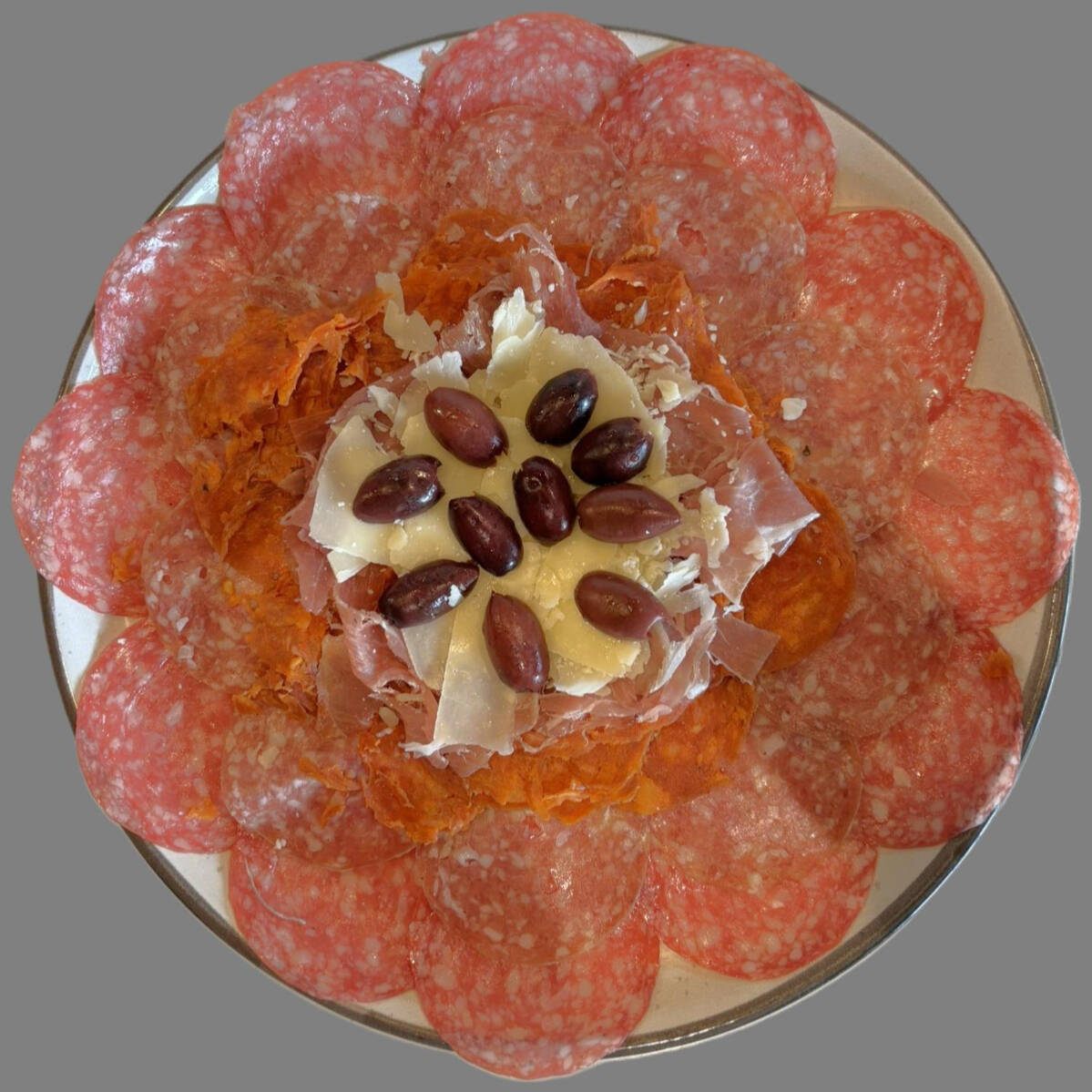Un plato para los amantes del salami, nuestra variedad "Salame Verona, Salame Genova, Salami Calabrese" acompañado de láminas de prosciutto y aceituna kalamata. Porción 215 gr