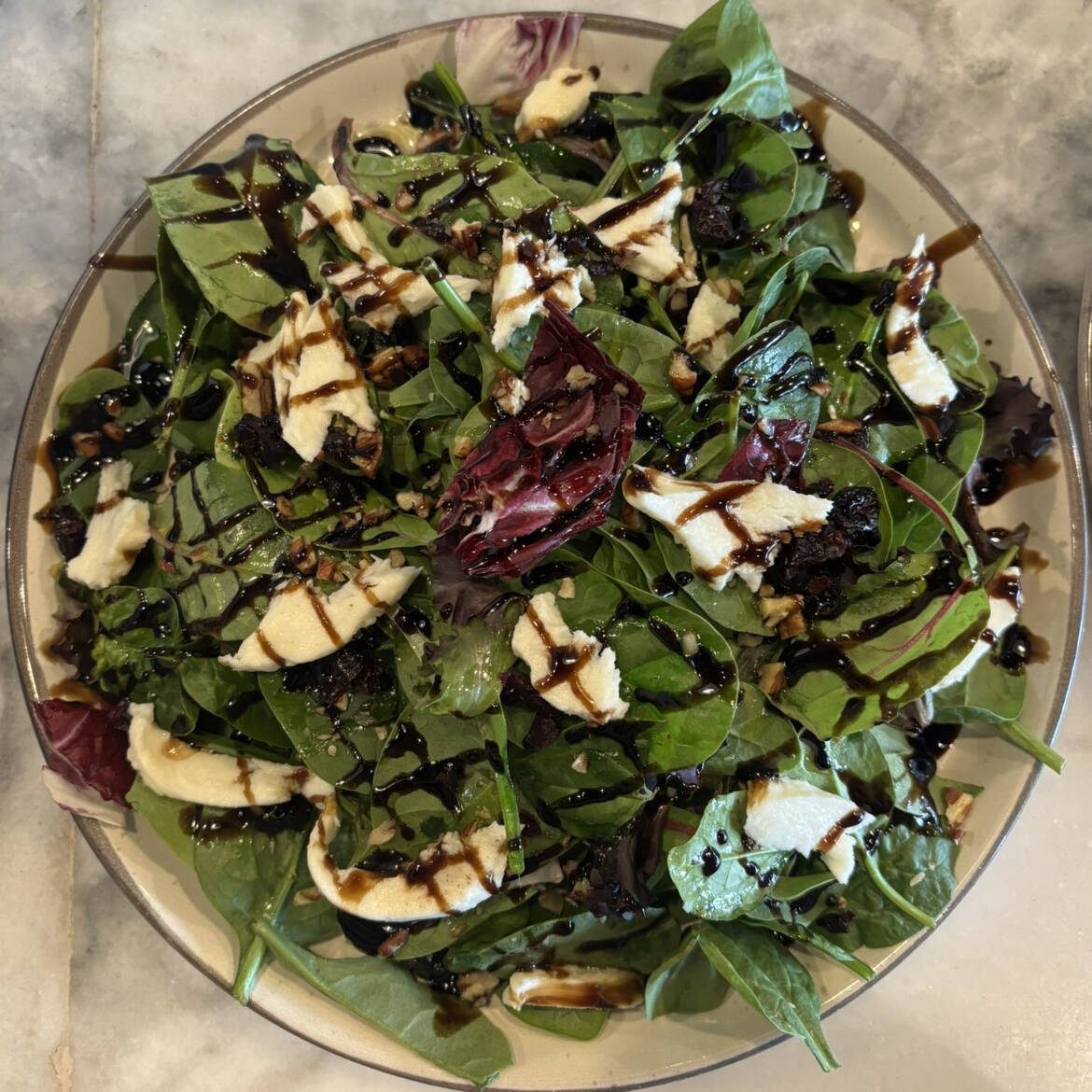 Lechugas mixtas adornadas con nuestro glaze balsámico, arándanos y nueces, coronado con nuestro queso mozzarella fresco. Porción 400 gr