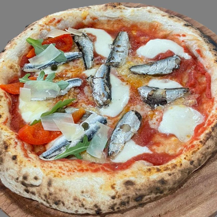 Una sonata de sabores explosivos entre las sardinas en aceite de oliva, pimiento morrón en salmuera y nuestra base clásica de queso Monterrey Jack y salsa de tomate. Diámetro 33~35 cm