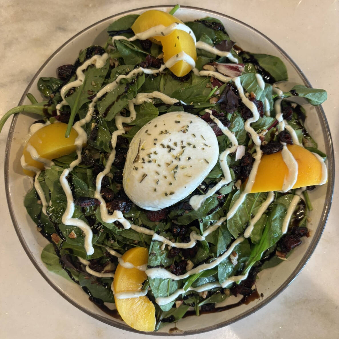 Lechugas mezcladas con rodajas de durazno, nuez espolvoreada, arándanos troceados, un toque de aceite de oliva y reducción de balsámico, aderezado con aderezo de queso azul y una pieza completa de queso tipo burrata. Porción 446 gr