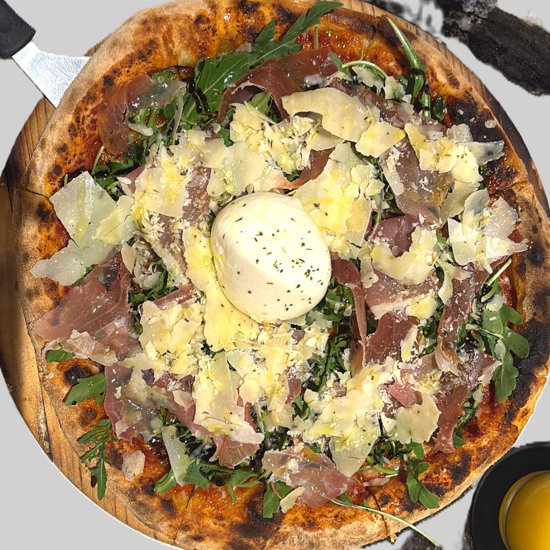 Salsa de tomate fresco con un toque de sal y pimienta, gratinada con abundante queso monterrey jack, con una cama de arúgula y rodeada de prosciutto, bañada de una reducción balsámica y aceite de olivo espolvoreado de queso parmesano y al centro una pieza completa de queso tipo burrata. Diámetro 33~35 cm