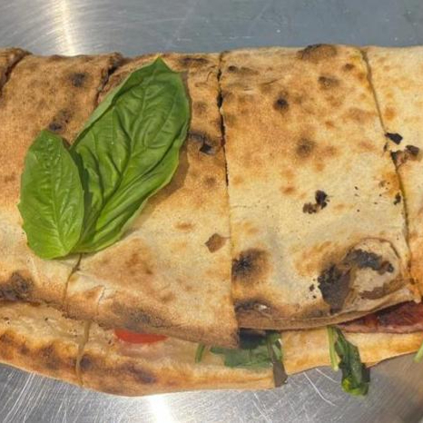 Pan crujiente por fuera y suave por dentro, relleno de prosciutto y salami calabrese ligeramente picante, con queso provolone fundido. Se complementa con pesto fresco y un toque de aceite Neri, logrando una combinación elegante e intensa de sabor italiano auténtico.