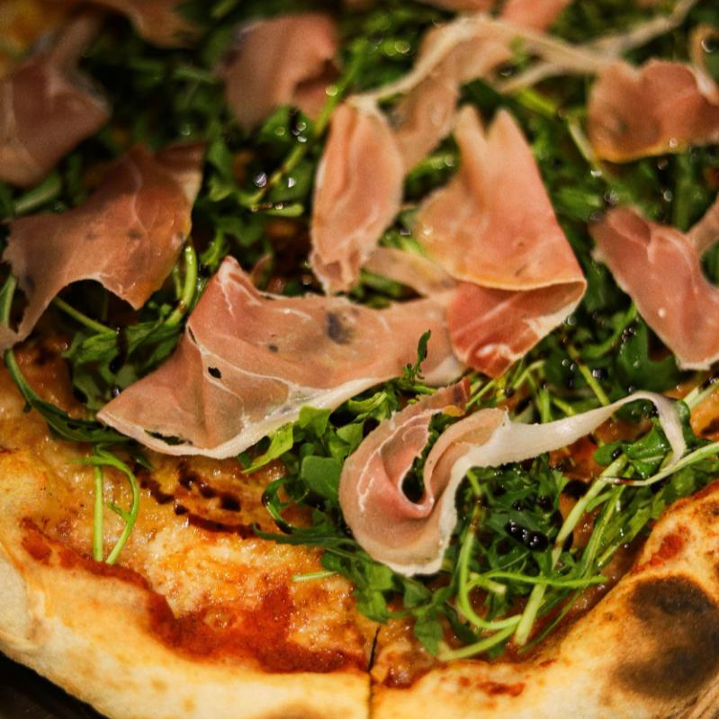 Salsa de tomate fresco con un toque de sal y pimienta, gratinada con abundante queso monterrey jack, con una cama de arúgula y rodeada de prosciutto, bañada de una reducción balsámica y aceite de olivo con hojuelas de queso parmesano. Diámetro 33~35 cm