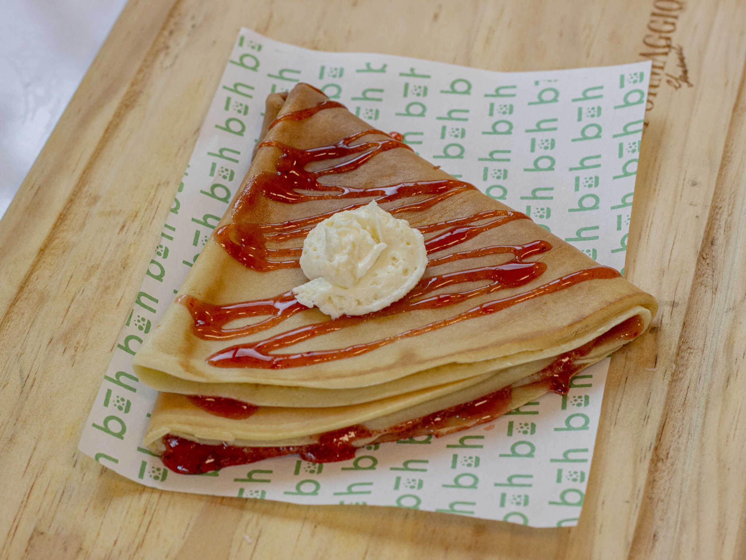 Consiéntete con una crocante crepa en combinación de fruto rojo y cremosa crema philadelphia.