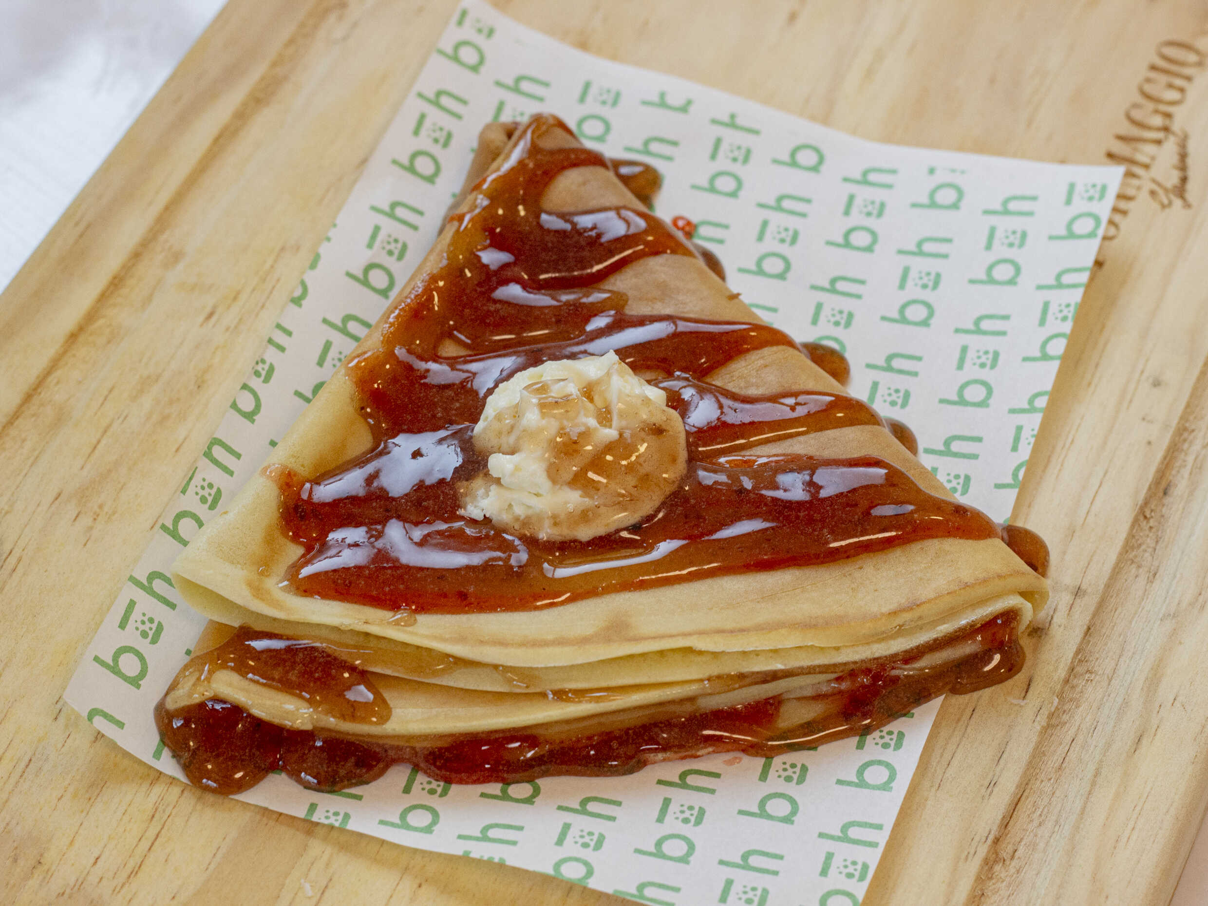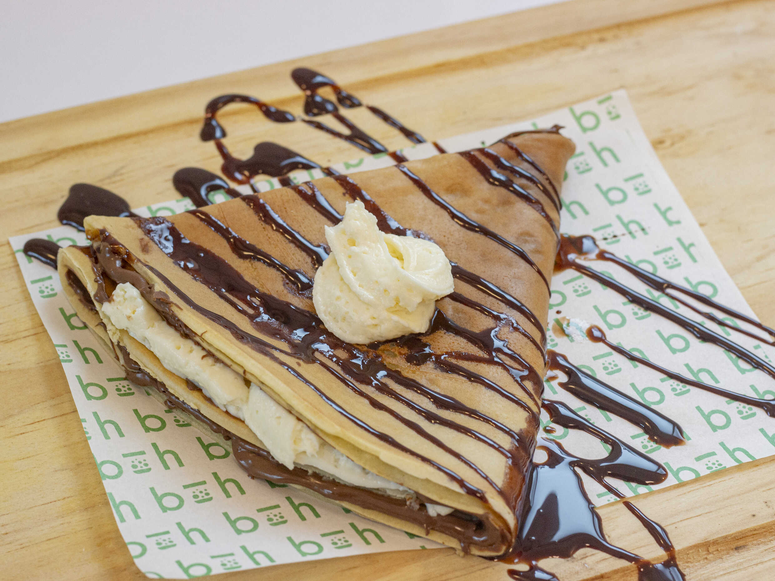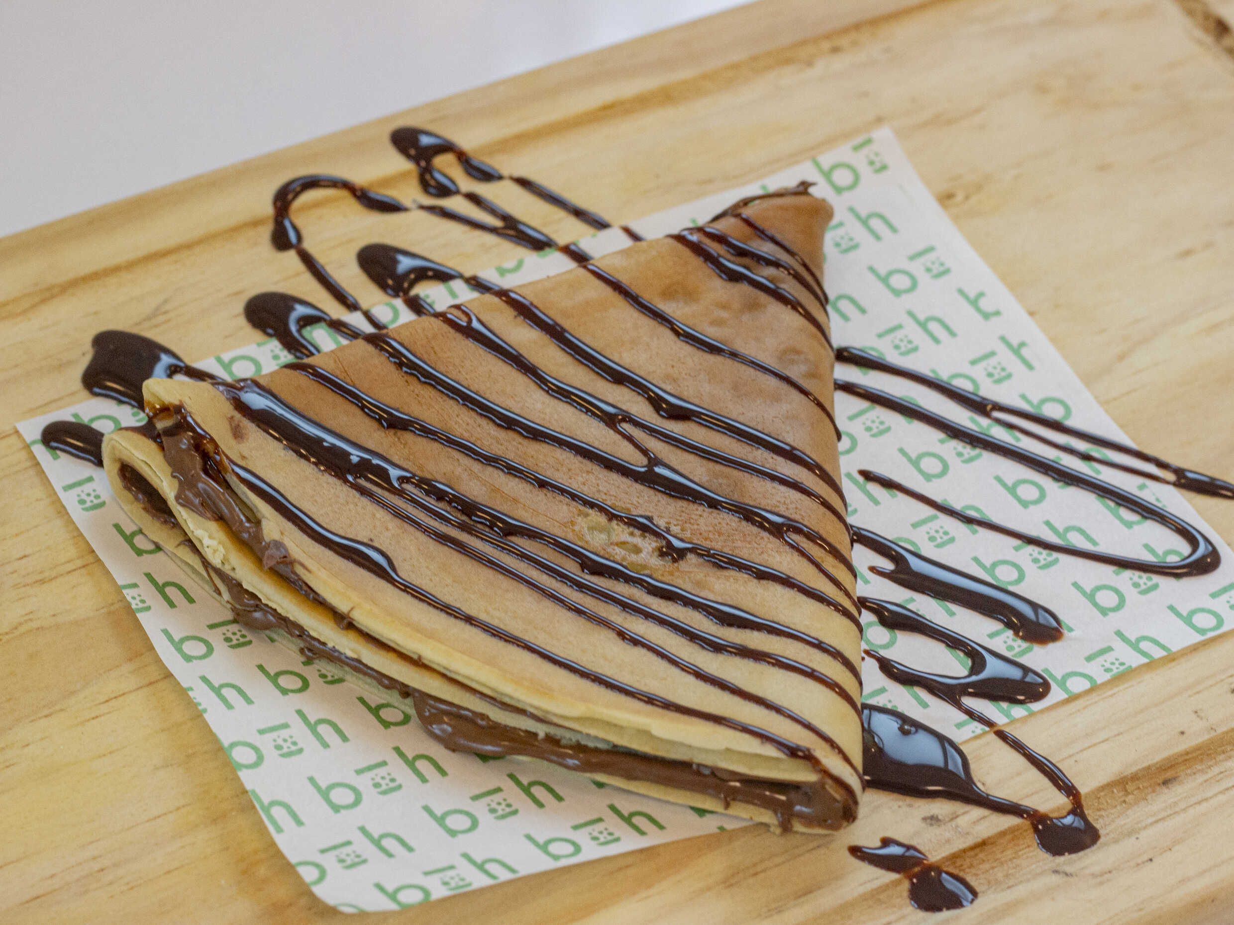 Crema de avellanas de cacao sobre una deliciosa crepa que te endulzará el paladar.