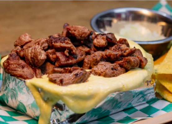 Papa entera gratinada con mantequilla, 3 quesos derretidos y una porción de arrachera preparada con cilantro, cebolla y salsa a su gusto.