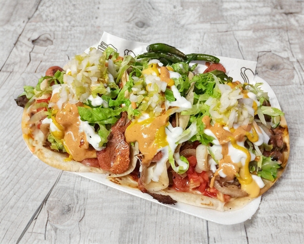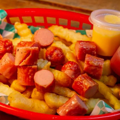 Porción grande de papas a la francesa, salchichas y aderezos cátsup, mayonesa y queso amarillo bañadas con los 3 quesos derretidos.