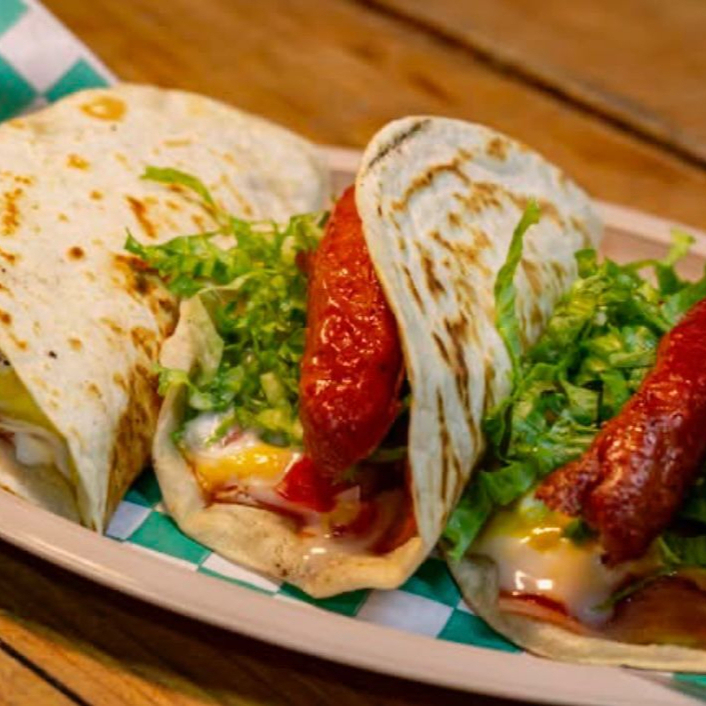 Tortilla de harina normal, salchicha, jamón, queso amarillo, queso de hebra, queso manchego, preparada con tomate cebolla y los aderezos.