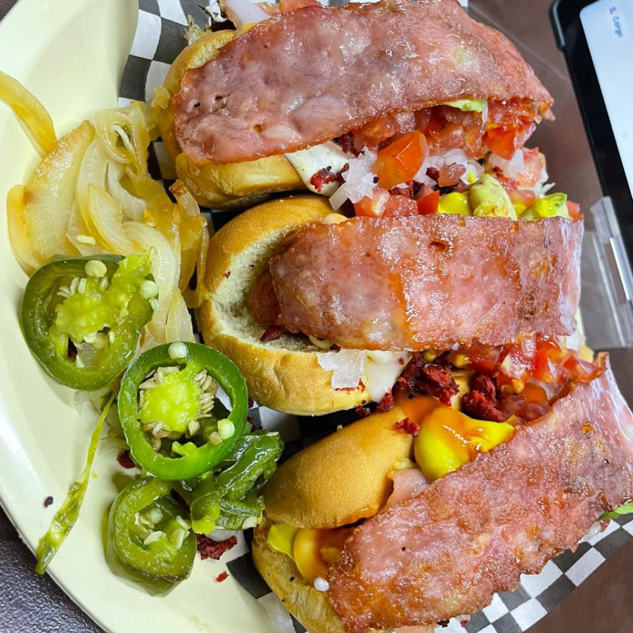 Pan, salchicha, jamón, queso de hebra, queso amarillo, queso manchego, aguacate, tomate, cebolla, chorizo, tocineta y todos los aderezos.