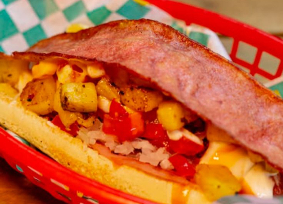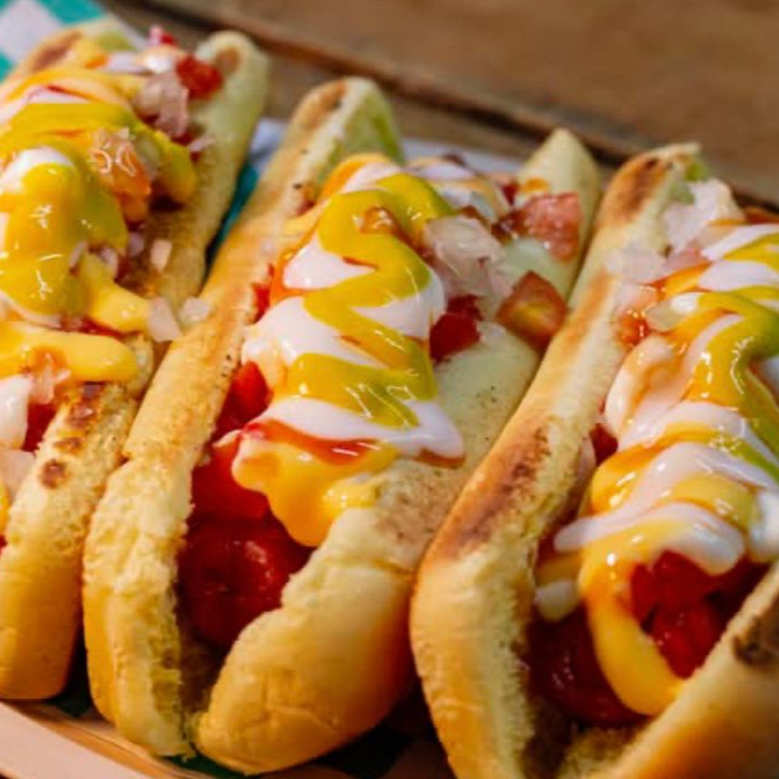 Pan de hot dog jumbo, salchicha jumbo, jamón, queso amarillo, queso manchego, queso de hebra, chorizo, tocino, tomate cebolla, aguacate y aderezos.